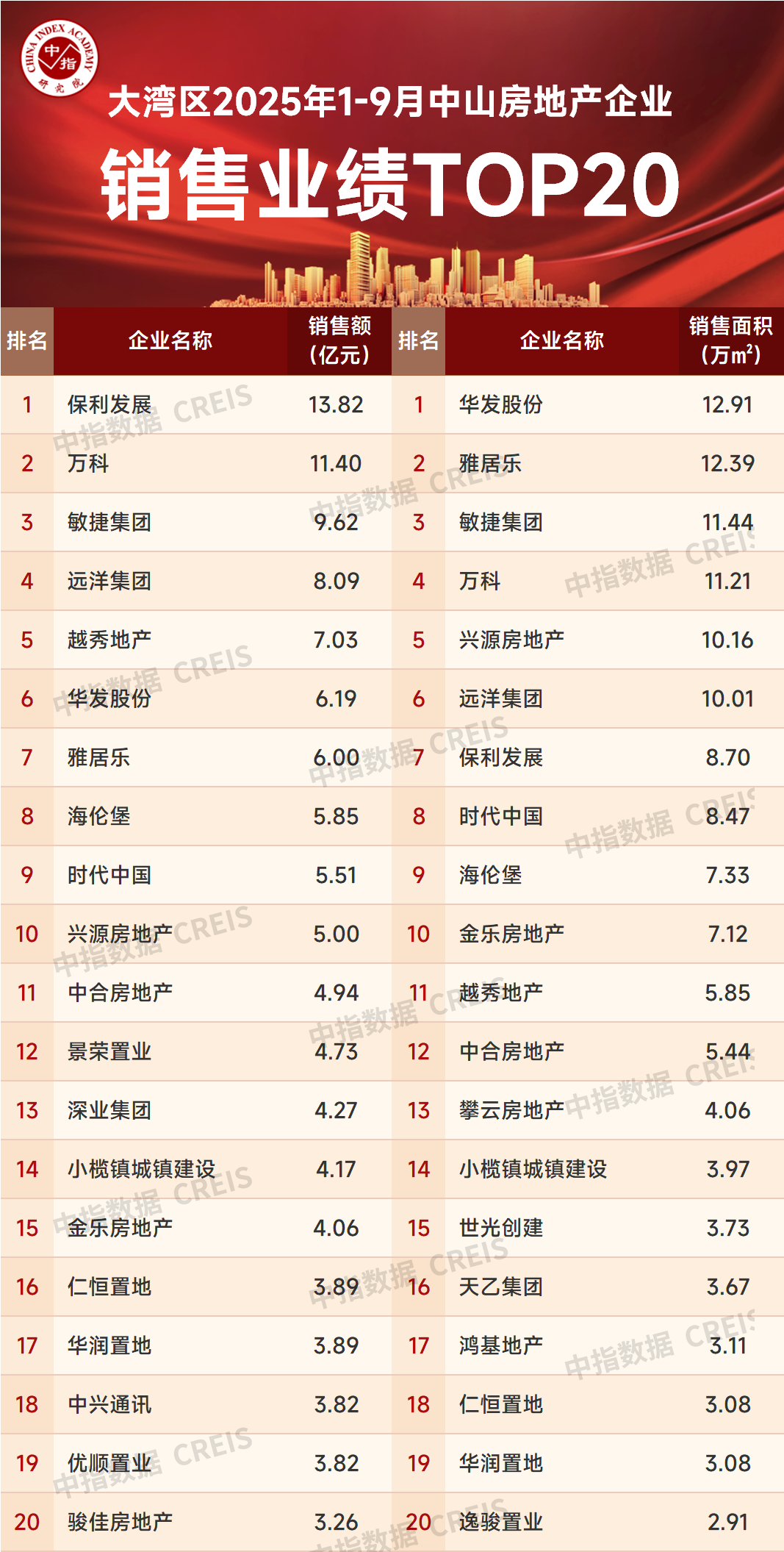 特别声明:房地产企业销售数据统计是以2025年1月1日—9月28日期间销售的商品房为统计口径,主要依据中指数据CREIS(点击查看)在中山市的销售监测数据,对于监测不全的项目数据,由企业提供相关文件并严格审核,也纳入统计范围。本报告仅供参考,我方不对使用报告及其内容所引发的任何直接或间接损失承担责任。