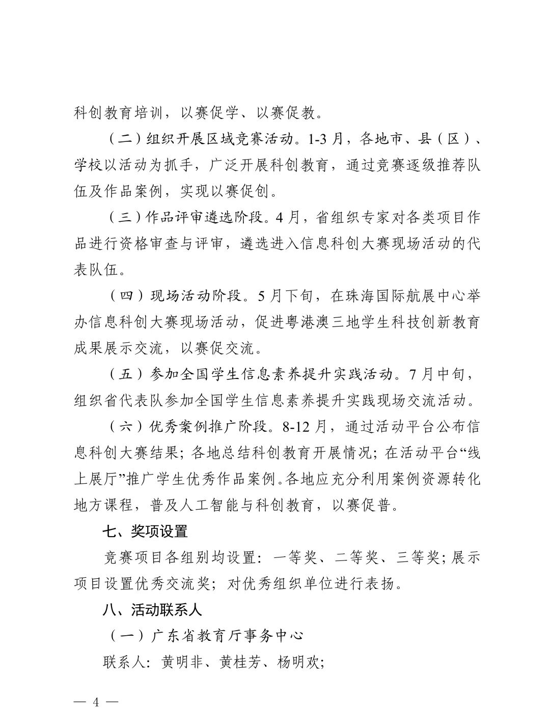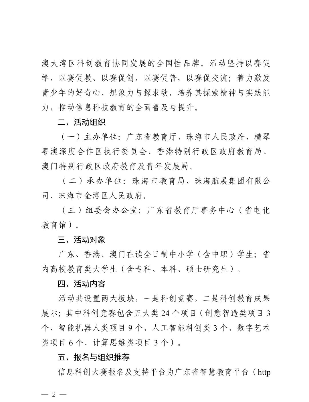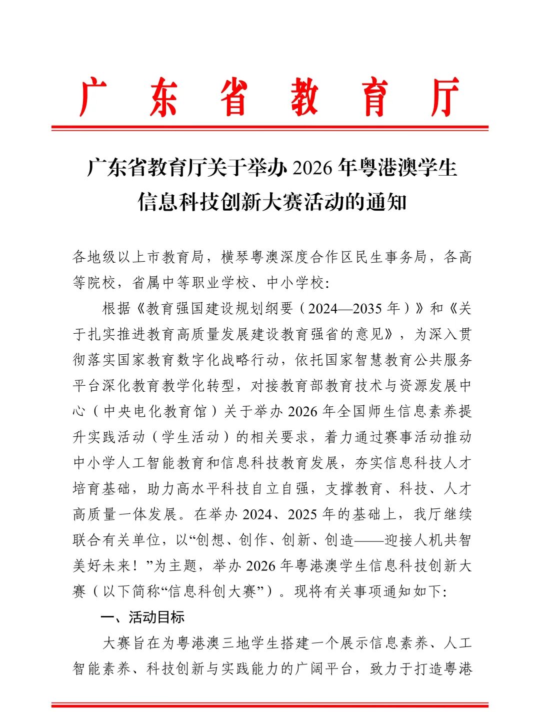 根据《教育强国建设规划纲要(2024—2035 年)》和《关于扎实推进教育高质量发展建设教育强省的意见》,为深入贯彻落实国家教育数字化战略行动,依托国家智慧教育公共服务平台深化教育教学化转型,对接教育部教育技术与资源发展中心( 中央电化教育馆)关于举办 2026 年全国师生信息素养提升实践活动( 学生活动)的相关要求,着力通过赛事活动推动中小学人工智能教育和信息科技教育发展,夯实信息科技人才培育基础,助力高水平科技自立自强,支撑教育、科技、人才高质量一体发展。在举办2024 、2025年的基础上,我厅继续联合有关单位,以“创想、创作、创新、创造——迎接人机共智美好未来! ”为主题,举办 2026 年粤港澳学生信息科技创新大赛( 以下简称“信息科创大赛”)。现将有关事项通知如下: