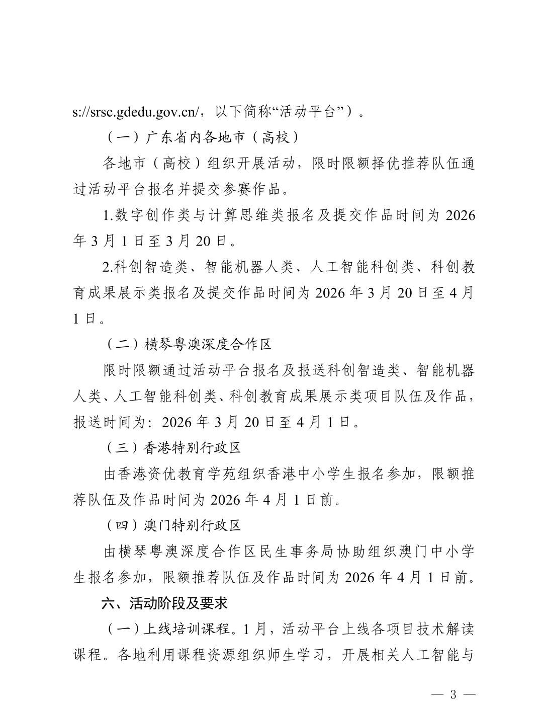 (四)澳门特别行政区由横琴粤澳深度合作区民生事务局协助组织澳门中小学 生报名参加,限额推荐队伍及作品时间为 2026 年 4 月 1 日前。