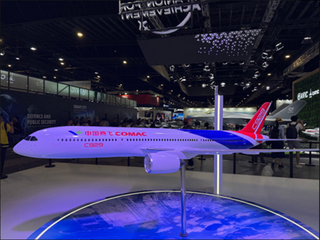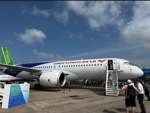 中国商飞 C919中国首款自主研制的单通道干线客机,图中为 “商飞快线” 演示涂装,是本次航展的明星机型。座位数158192 ,航程 40755550 公里,对标空客 A320neo 与波音 737 MAX。采用 LEAP-1C 发动机,航电、飞控等核心系统实现自主可控,是中国民机产业迈向高端制造的标志性产品。首次在东南亚进行飞行演示与静态展示,向亚太市场证明其安全性与竞争力,标志着中国正式进入全球干线客机市场,打破了欧美长期垄断的格局。