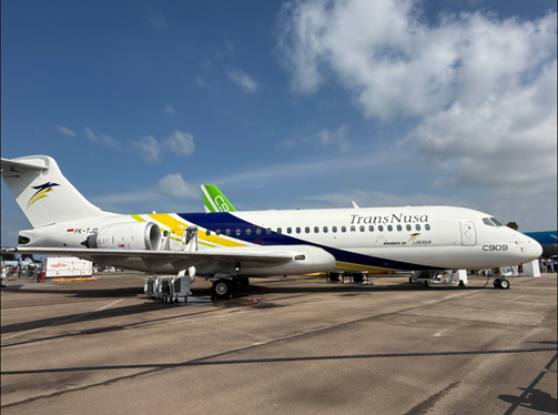 中国商飞 C909 ARJ21-700中国首款自主研制的涡扇支线客机,图中为印尼连城航空(TransNusa)的运营涂装。座位数7890 ,航程22253700 公里,采用 CF34-10A 发动机,具备良好的高温、高原起降性能,适合东南亚等热带 / 山地环境。此次展出标志着中国支线客机已实现商业化运营与国际市场突破,是中国民机从“支线到干线” 的重要一步。