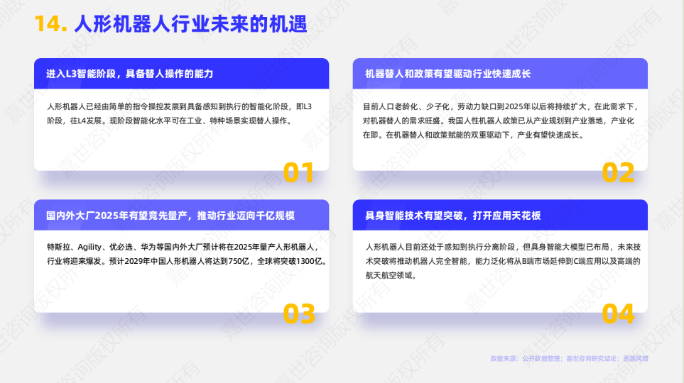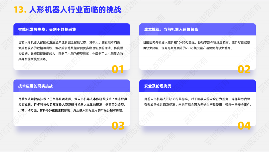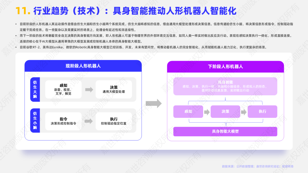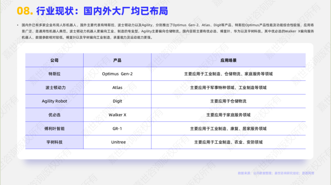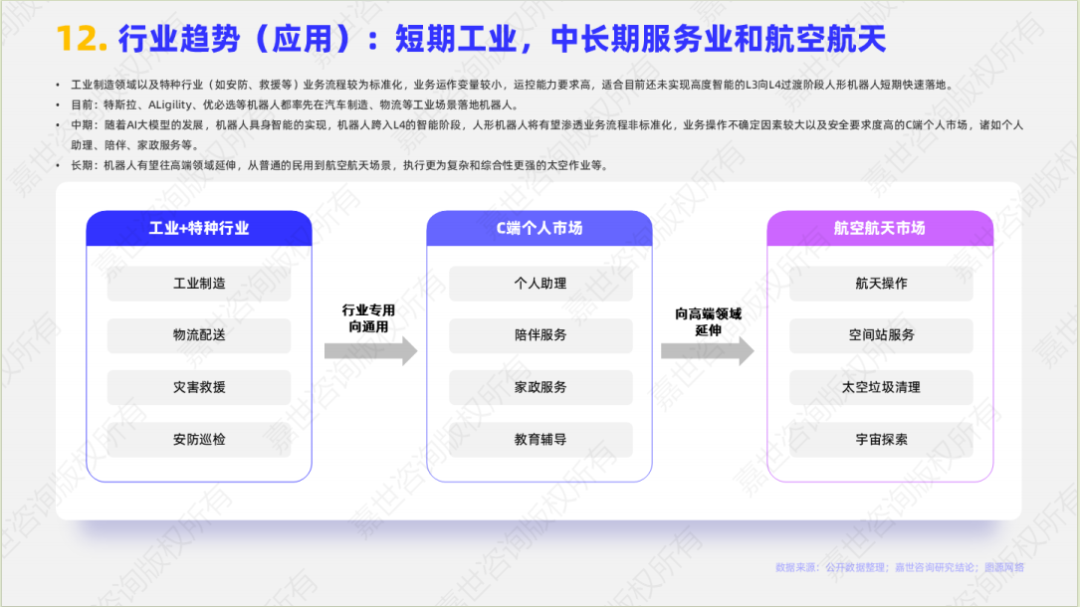 报告核心内容剖析了技术演进与商业应用的关键路径。技术正向基于具身智能大模型的“感知决策一体化”演进,推动完全自主智能实现。应用路径上,短期将快速渗透工业制造等B端场景,中长期将延伸至个人服务、航空航天等领域,实现从 “行业专用”走向“通用服务”
