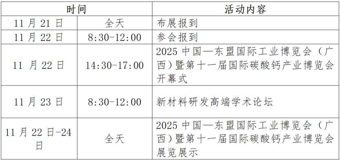 由国家工信部相关司局、自治区工信厅指导,广西大学广西碳酸钙产业化工程院、广西碳酸钙行业协会主办的2025中国—东盟国际工业博览会(广西)暨第十一届国际碳酸钙产业博览会与新材料研发高端学术论坛,将于11月22日-24日在南宁国际会展中心隆重召开,大会设置八大专业展区,涵盖新材料、AI+制造、新能源汽车等多个领域,并举办新材料研发高端学术论坛、行业表彰、开幕式等多场配套活动。会议特邀产业链上下游企业、服务机构等500+单位参与,展会参展及观展规模超3000人,搭建产贸易对接平台,助力企业拓展东盟市场,推动碳酸钙产业向高端化、绿色化、智能化发展。