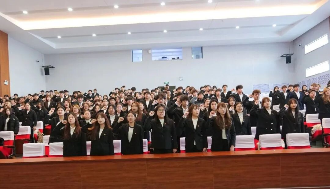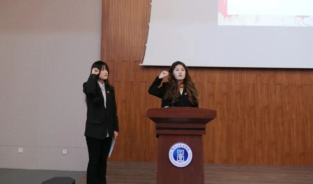 接着,新团员高举右拳,面向鲜艳的中国共产主义青年团团旗庄严宣誓:“我志愿加入中国共产主义青年团,坚决拥护中国共产党的领导……”铿锵有力的誓言回荡在报告厅内,表达了新团员们对党、对共青团的无限忠诚与为国家发展贡献青春力量的坚定决心。