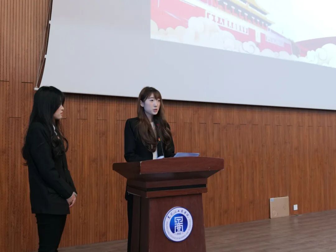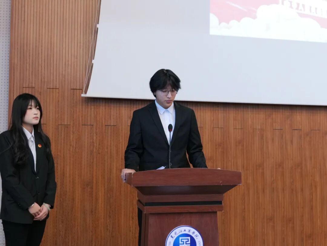 仪式在激昂的团歌《光荣啊!中国共青团》中拉开序幕,全体人员肃立行注目礼,激昂的旋律点燃了在场每一位青年的爱国热情。团总支组织部部长李汶纹宣读了新团员名单。随后,新团员们面带自信笑容,依次上前接受团徽佩戴。当熠熠生辉的团徽别在胸前时,新团员们眼神坚定,脸上洋溢着光荣与自豪,这枚小小的团徽不仅是身份的象征,更是一份沉甸甸的责任与使命。