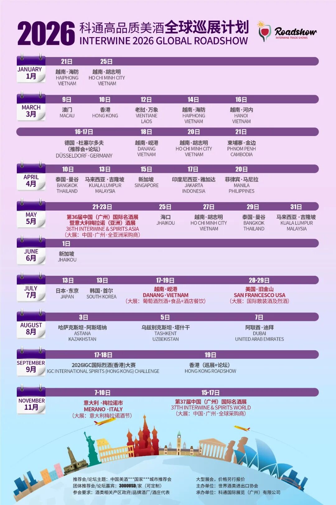 横跨欧美及大洋洲,在法国巴黎、意大利米兰、美国纽约、澳大利亚悉尼等全球酒业核心城市举办巡展、论坛及商务考察。