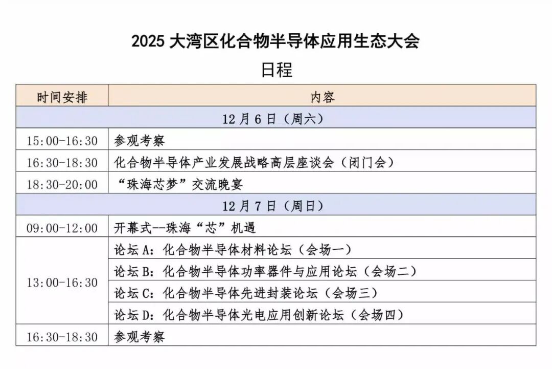 为紧抓化合物半导体产业爆发机遇,进一步发挥珠海产业及应用市场优势,第三代半导体产业技术创新战略联盟将于2025年12月6-7日在珠海高新区香山会议中心组织召开首届“大湾区化合物半导体应用生态大会”。大会将围绕国家重大战略和第三代半导体产业链发展需求,邀请重量级专家、学者及产业链重点企业代表深入探讨上下游协同发展中的问题,为新时期化合物半导体技术突破及产业发展战略提供建议。