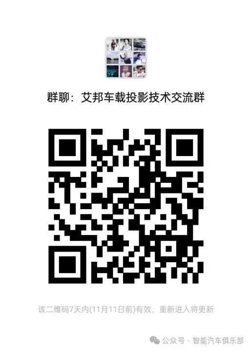 随着汽车智能化网联化发展,车载投影技术在行车安全、车内娱乐交互等多方面有着广泛的应用场景。目前已有大众、比亚迪、吉利、小鹏、蔚来、上汽、北汽、赛力斯、摩比斯、法雷奥、华为、华阳、星宇、华域视觉、彼欧、光峰、迪擎光电、小象光显、深微光电、歌尔、拜波赫、极米、舜宇、微瑞光学、蓝特光学、TI、芯鼎微、海思、英唐智控等产业链上下游企业已进群。识别下方二维码,即可加入车载投影技术交流群。