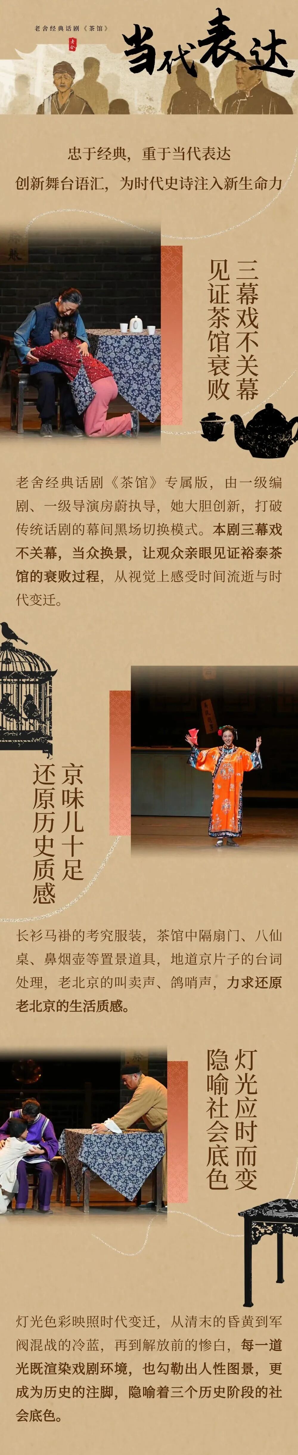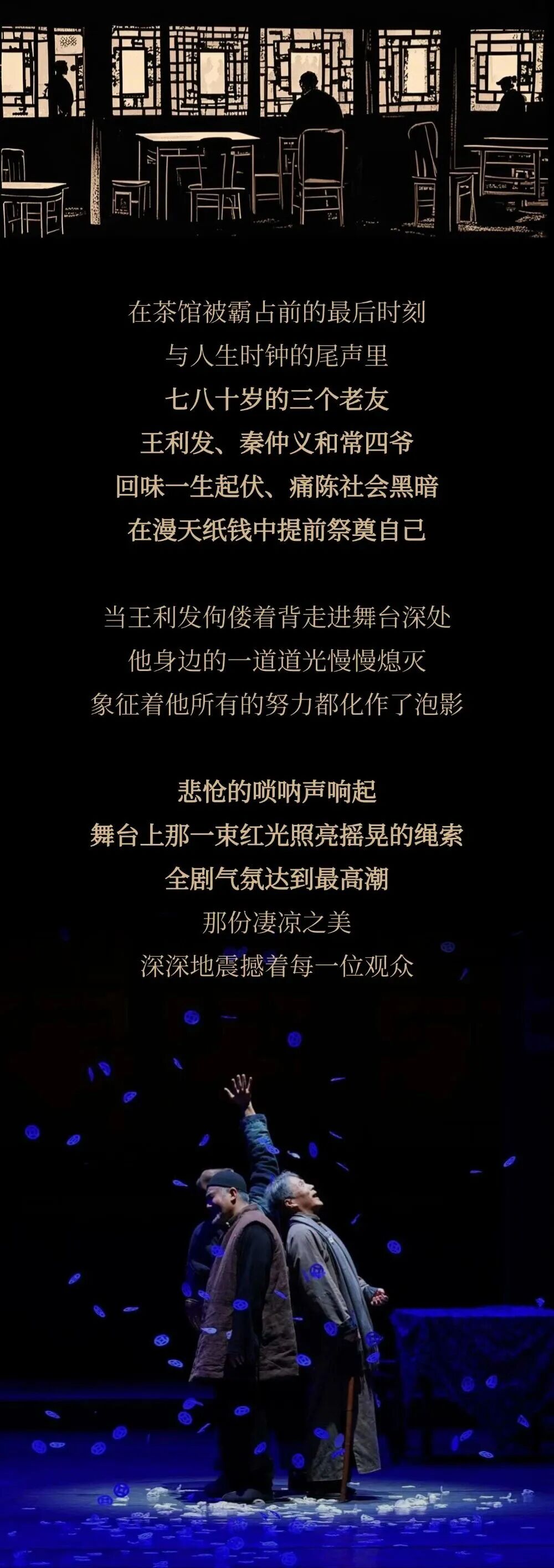通过微型社会舞台,浓缩半个世纪中国社会变迁史,折射时代洪流下王利发、常四爷、秦二爷等20余位小人物的命运浮沉,个人的无力、权贵的压榨、理想的破灭.…….一切静待观众去感受。