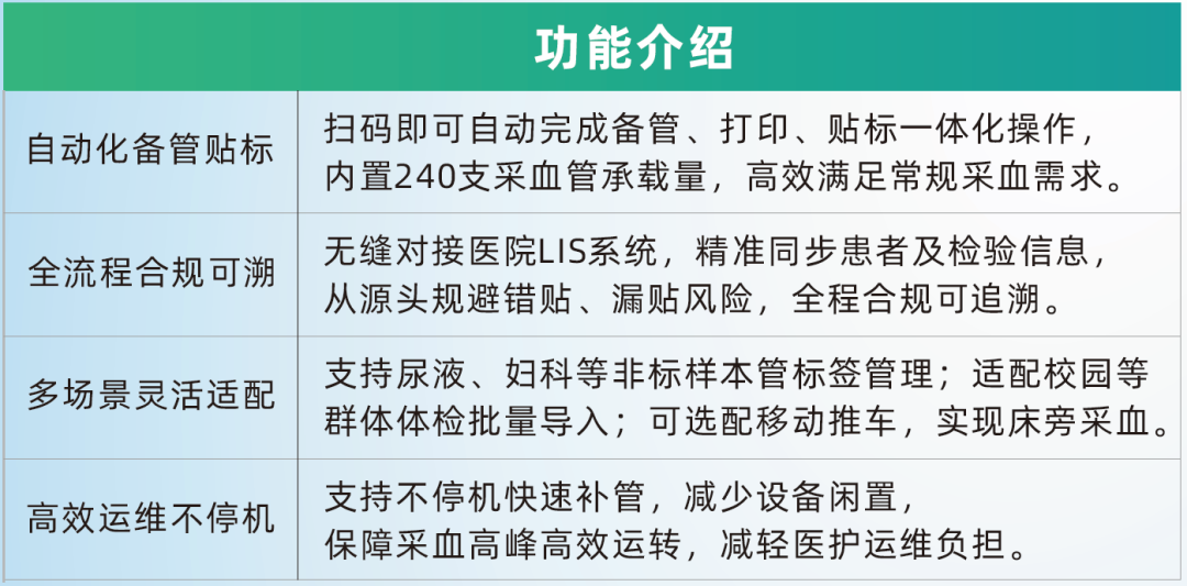 智能真空采血管备管机本智能真空采血管备管机采用紧凑型设计,机身轻便易部署,专为社区卫生服务中心、医院病房、门诊采血室等高频采血场景量身打造,通过自动化技术重构采血备管流程,提升医疗效率与诊疗安全性。
