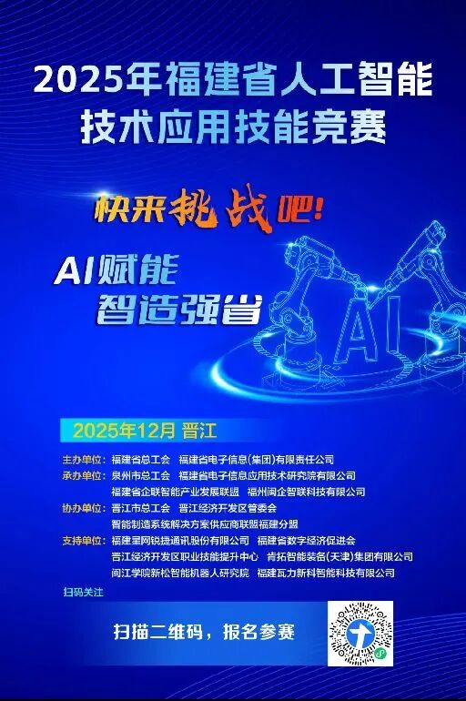 由福建省总工会、福建省电子信息集团主办的“2025福建省人工智能技术应用技能竞赛”将于12月在晋江打响!
