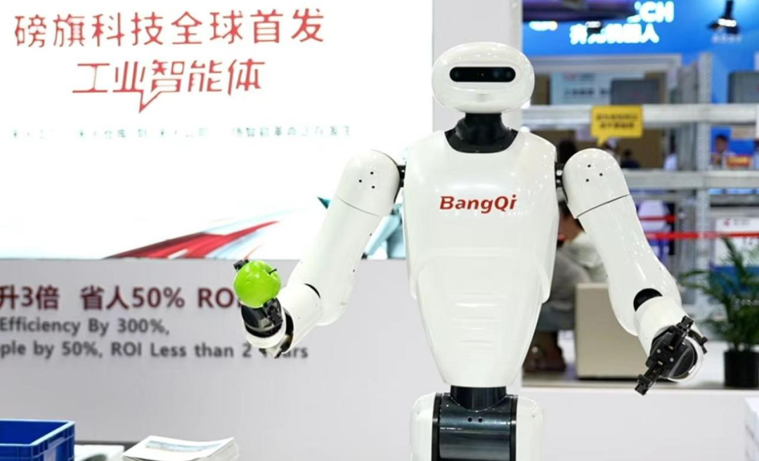 此外,全球无人工厂、无人仓库引领者磅旗科技首次登陆工博会。磅旗科技构建了一个微缩的“未来工厂”,其自主研发的具身机器人流畅完成了识别、抓取、搬运物料的完整流程,并与料箱机器人(CTU)实现自主协同,模拟了无人化产线的实际运作。