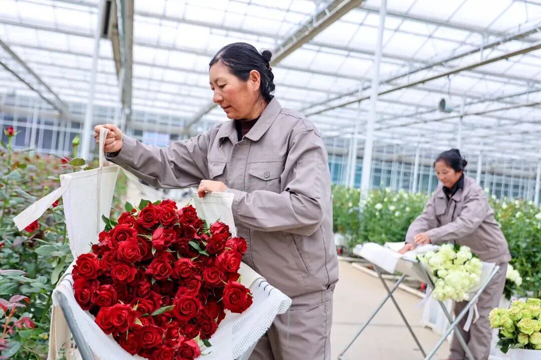 丽江现代花卉产业园工作人员打包玫瑰鲜切花。 陈飞 胡妤雅 摄