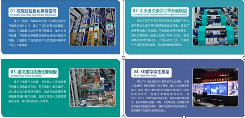公司智慧仓储物流创新采用先进技术与模型实现仓储智慧化管理,应用包括大小波次最优订单分配模型、波次接力拣选任务模型以及数字孪生技术: