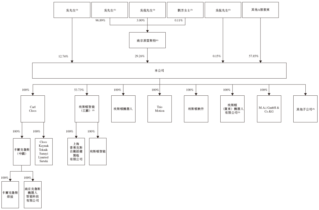 招股书显示,埃斯顿的控制权由吴波家族牢牢掌握,形成典型的家族控股架构。控股股东集团包括公司董事长、首席战略官吴波,其配偶刘芳,儿子吴侃及南京派雷斯特科技有限公司。截至最后实际可行日期,该家族合计可行使约42.15%的表决权。