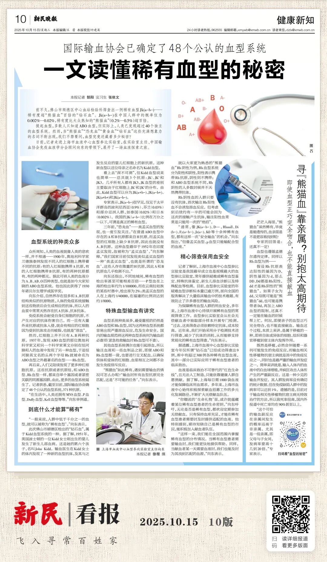 人类已发现超过40个独立的血型系统。目前,上海市血液中心血型参比实验室的年疑难血型诊断标本量已逾万例,面向全国的服务解决了大量临床输血中的技术难题,有效防止了许多潜在的输血风险。【详情】