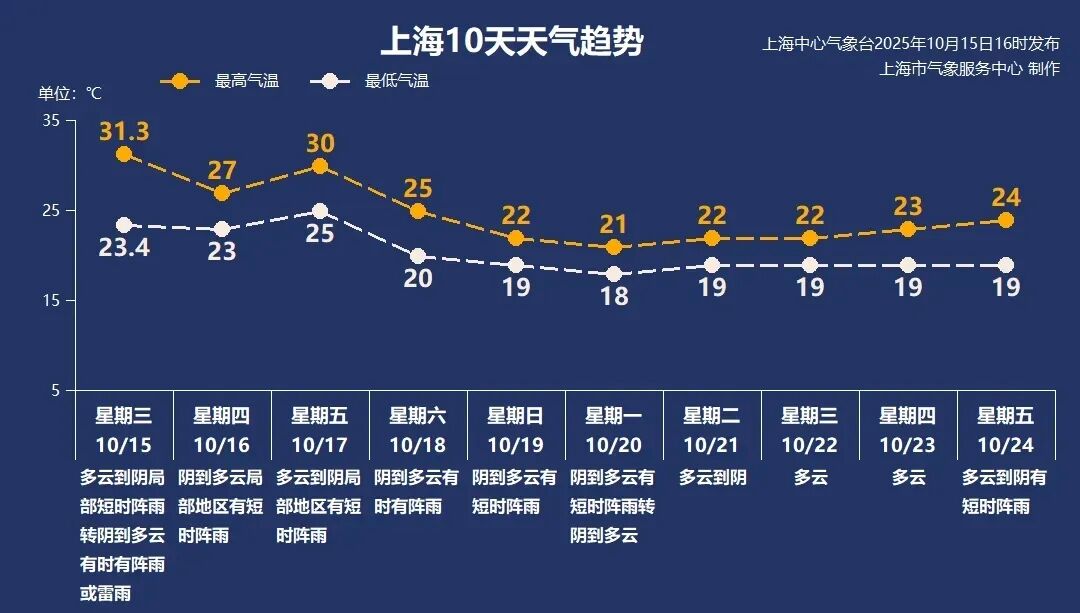 明天冷空气还没影响到上海,气温会有个小反弹,最高温再度升至30℃左右。预计周六早晨前后,冷空气前锋抵达上海,刮风又下雨,气温也将明显下降。后续冷空气陆续补仓,风力持续偏大,周日和下周初市区最低气温降至18~19℃,最高22℃上下。