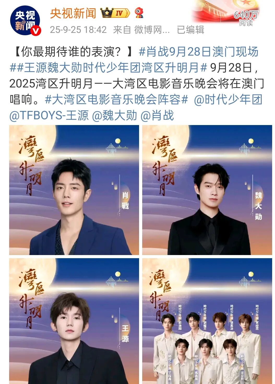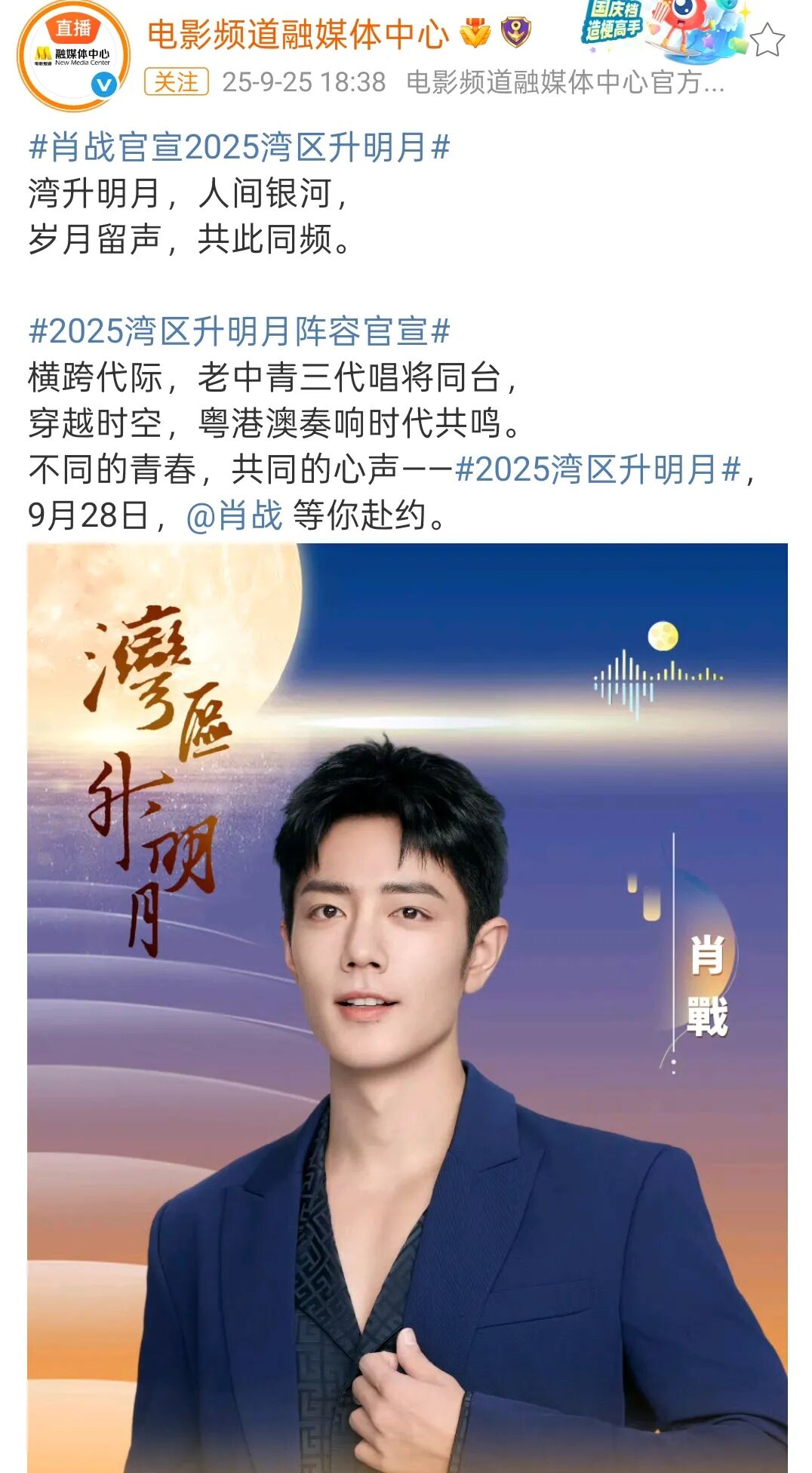 9月25日,电影频道融媒体中心、新华社、央视新闻、人民日报等权威媒体同步官宣肖战加盟,文案“湾升明月,人间银河;岁月留声,共此同频”尽显文化底蕴。