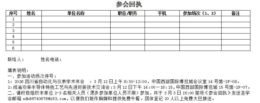 1、参会代表请于33日前按表格中的要求填写附件表——“2026四川省自动化与仪器仪表学术年会参会回执”;