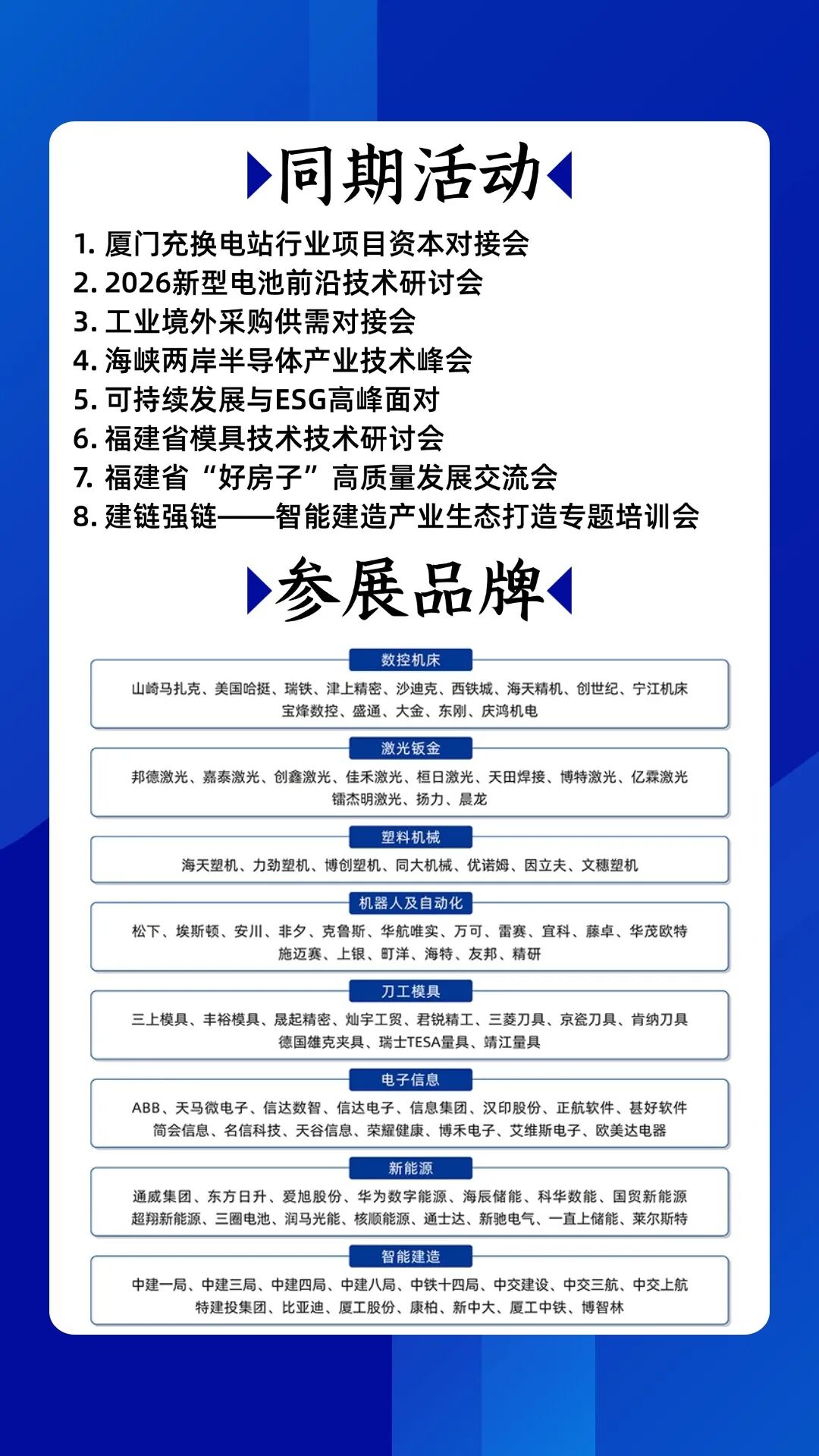 作为链接两岸、辐射全球的工业生态平台,2026厦门工博会以“30载厚积向新而行”为主题,延续经典“1+N”展览架构,以工博会为核心引擎,联动电子制造与信息技术、“好房子”科技暨智能建造专题展,完整覆盖从基础材料、核心零部件到智能装备、系统解决方案的全产业链条。通过展览展示、会议活动、供需对接等多元形式,全新打造数智化全链生态展示平台,深度贯通“研造用创”,驱动制造业数字化转型升级和高质量发展。