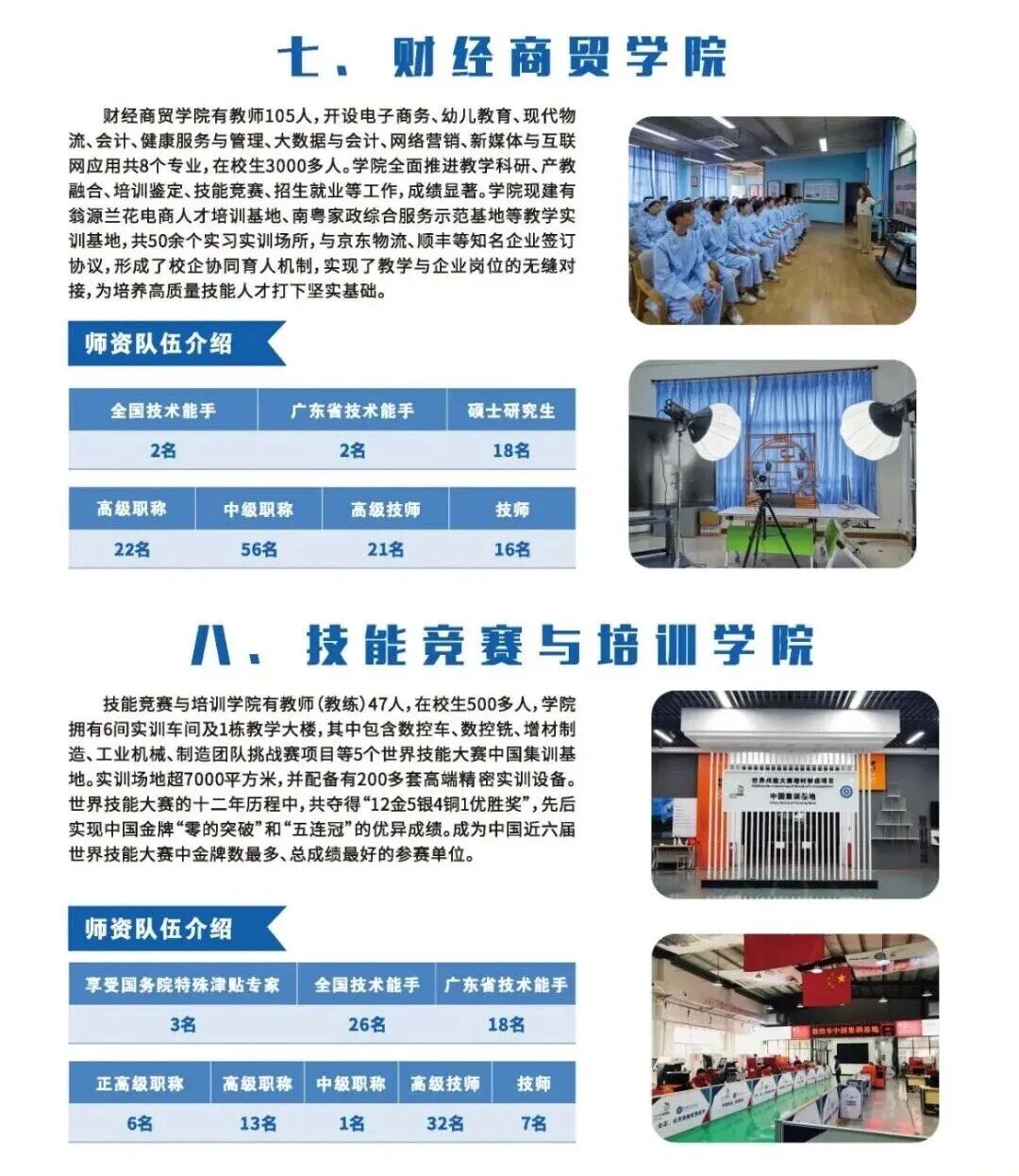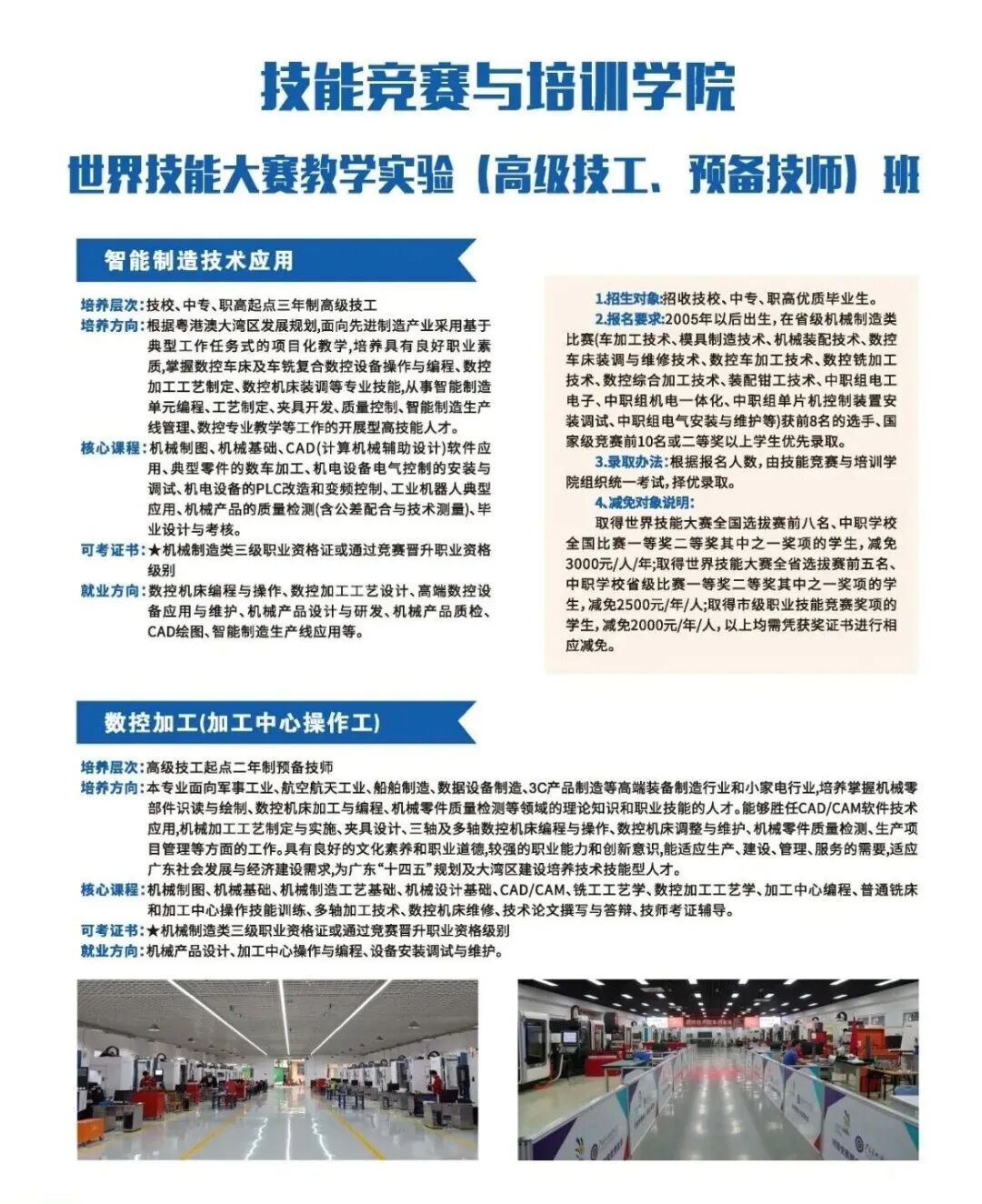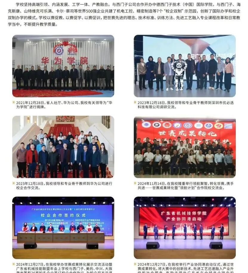 学校是广东省三所“全国一流技师学院”和首批十所“高水平技师学院”之一,是世界技能大赛(以下简称“世赛”)数控铣、数控车、制造团队挑战赛、工业机械、增材制造等5个项目的中国集训基地,国家高技能人才培训基地,全国首批28所国家职业训练院试点单位之一。