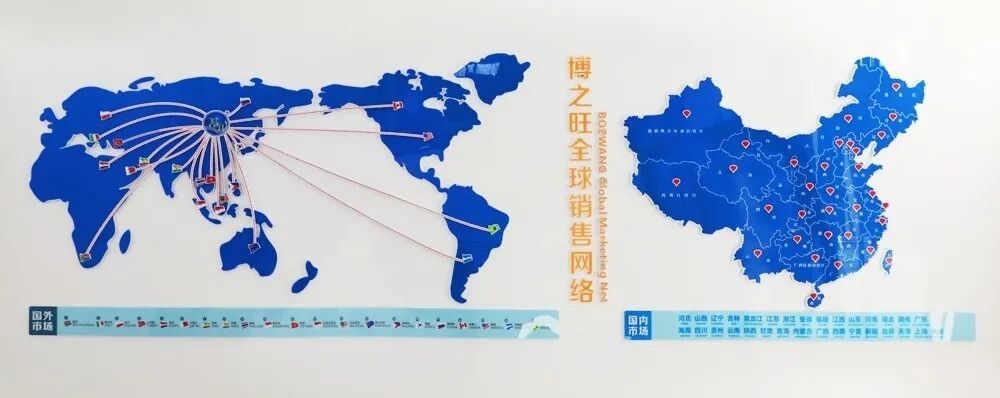 在国际化进程中,博之旺不断完善国际经营体系。公司所生产设备除广泛运用于国内各个行业,还远销韩国、日本、菲律宾、越南、马来西亚、新加坡、泰国、印度尼西亚、孟加拉国、印度、巴基斯坦、斯里兰卡、哈萨克斯坦、伊朗、沙特阿拉伯、阿拉伯联合酋长国、柬埔寨、土耳其、德国、波兰、捷克、匈牙利、俄罗斯、英国、法国、罗马尼亚、意大利、荷兰、克罗地亚、保加利亚、立陶宛、挪威、斯洛文尼亚、葡萄牙、摩尔多瓦突尼斯、摩洛哥、南非、埃及、加拿大、美国、墨西哥、萨尔瓦多、洪都拉斯、海地、巴西、哥伦比亚、阿根廷、澳大利亚、新西兰等全球近一百多个国家和地区,并在韩国、越南、日本、印度、西班牙、意大利、土耳其、波兰、俄罗斯、巴西、墨西哥、美国等国家设立分公司及授权代理公司。秉承经营客户,成就客户理念,力求为全球更多客户提供高效优质的服务。建立更强大的国际技术团队,将博之旺做实做强,全力打造博之旺国际品牌影响力及提高国际市场占有率,努力成为中国制造领航者。