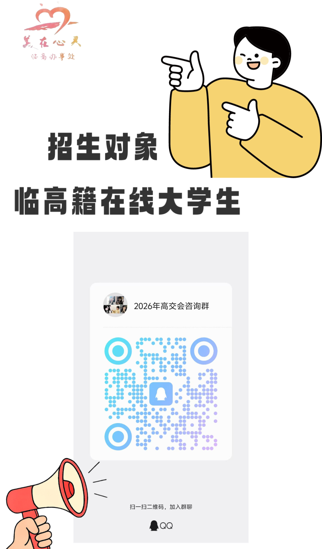 海南美在心灵临高办事处诚邀临高籍在校大学生参加本次的高中交流会,如果感兴趣,欢迎扫描下方二维码,加入我们的QQ高交会咨询群,有任何疑问都可在群里提问,工作人员会为你答疑解惑,期待各位加入我们。