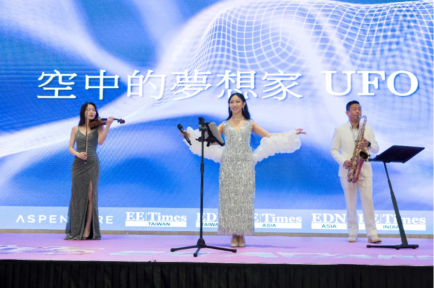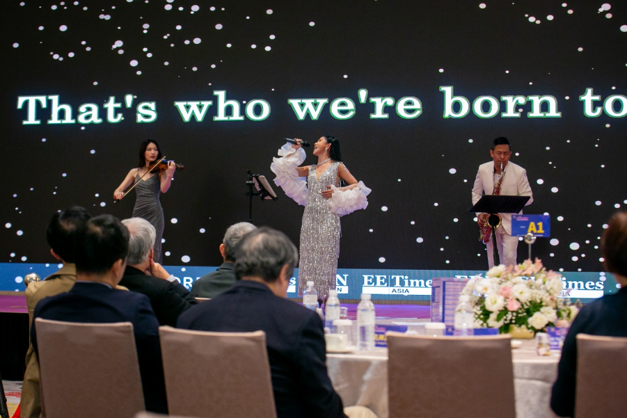 今年EE Awards Asia颁奬典礼现场特别设置拍照留念区,以钻石象徵技的璀璨传承与永续愿景;现场并播放周年回顾影片,展现EE Awards自成立以来的关键时刻。 开场表演以一曲《Golden》、《空中的梦想家》演唱揭开序幕,象徵企业与产业共创未来的理想启航,也带动全场感受亚洲电子创新生态的强劲脉动。