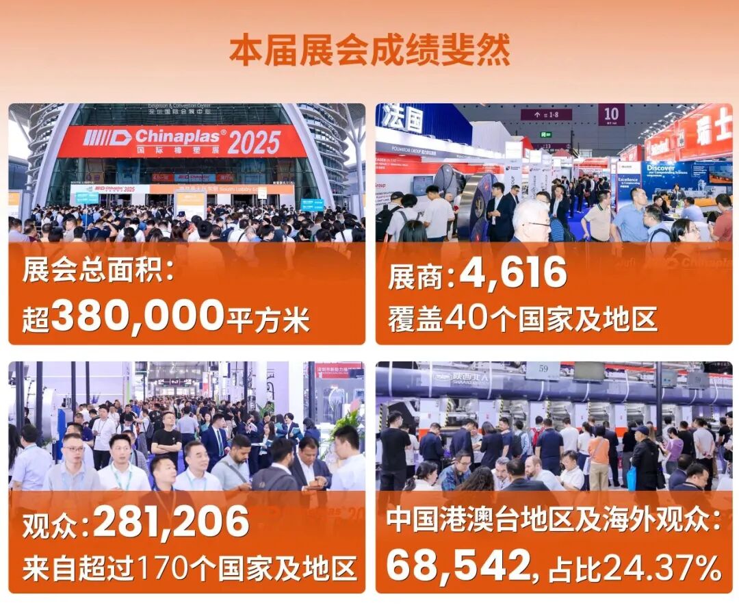这场全球橡塑行业的顶级盛会,以超38万平方米的展示规模、4,616家参展企业、281,206名专业观众的亮眼数据,彰显了其作为全球领先橡塑展的非凡影响力和强劲号召力。