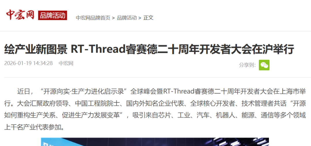 1月17日“开源向实·生产力进化启示录”全球峰会暨RT-Thread睿赛德二十周年开发者大会在上海临港成功举行。这一汇集全球开发者智慧、展现中国开源力量的产业盛会,迅速吸引了众多主流权威媒体的目光。
