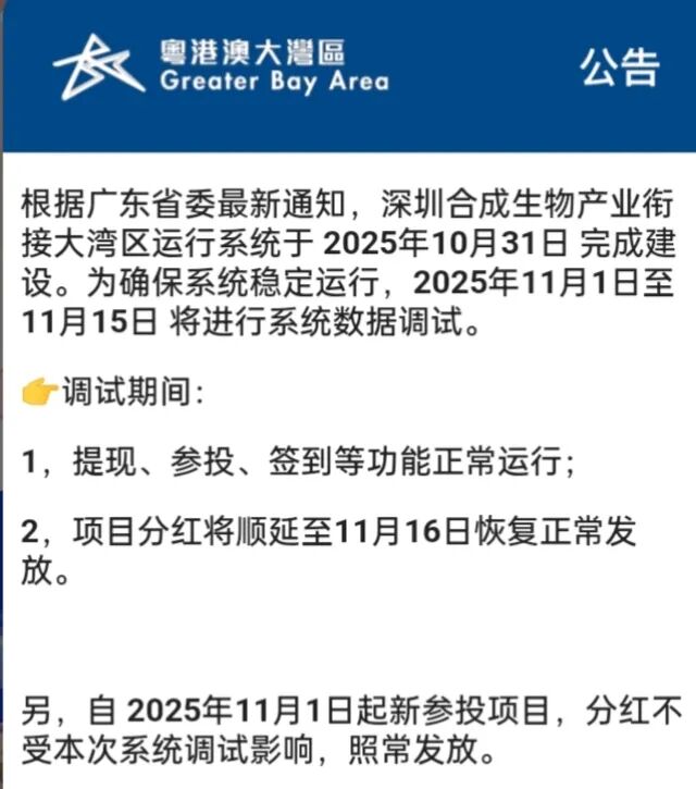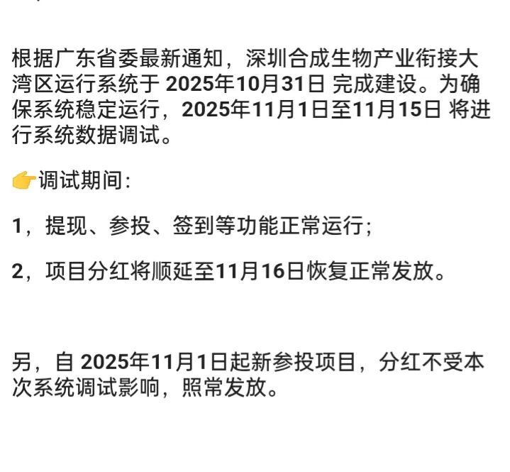 根据广东省委最新通知,深圳合成生物产业衔接大湾区运行系统于 2025年10月31日 完成建设。为确保系统稳定运行,2025年11月1日至11月15日 将进行系统数据调试。