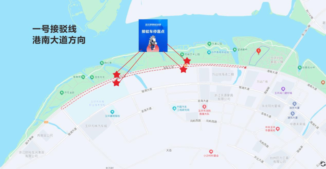 线路二:沿万达广场、玉环阀门城周边,安排2辆车,沿线环线接驳。