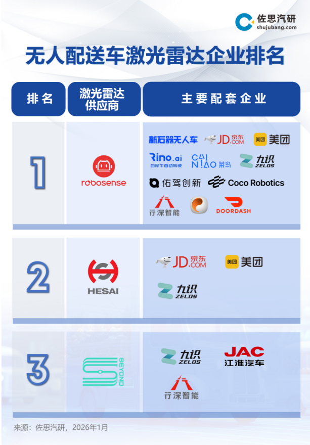 2026年2月24日,佐思产研一份行业数据,把这家低调的“卖水人”推到了聚光灯下:高潜力的无人配送车细分市场,速腾聚创的激光雷达搭载量已稳居行业第一。