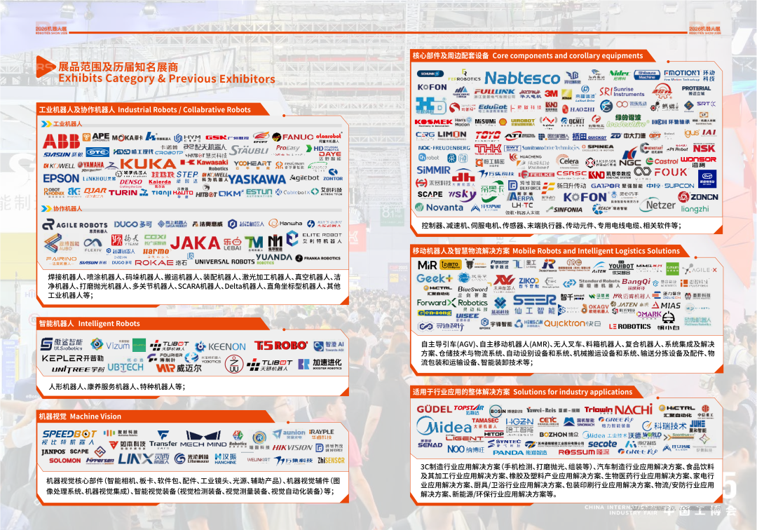 工业机器人及协作机器人:焊接机器人、码垛机器人、SCARA 机器人、协作机器人等(代表展商:FANUC、DENSO、JAKA、思灵机器人等) 智能机器人:人形机器人、康养服务机器人、特种机器人等(代表展商:UNITREE、UBTECH、傅利叶等) 核心部件及周边配套设备:控制器、减速机、伺服电机、传感器等(代表展商:绿的谐波、Nabtesco、MiSUMi 等) 移动机器人及智慧物流解决方案:AGV、AMR、无人叉车、仓储物流系统等(代表展商:MiR、Geek + 等) 机器视觉:智能相机、视觉检测装备、图像处理系统等(代表展商:科瑞技术、视比特机器人等) 行业应用解决方案:3C 制造、汽车制造、食品饮料、生物医药等领域整体方案(代表展商:哈工智能、SUPCON 等) 历届参展商规模:600 + 家知名企业参展