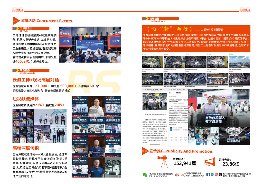 行业峰会:中国机器人高峰论坛暨 CEO 圆桌峰会(自 2012 年起举办,2025 年主题为 “AI + 机器人解锁多元场景新机遇”) 特色活动: 工博日日谈(聚焦 AI 赋能高端装备、机器人重塑产业链等五大议题) 现场直播:央视频系列报道、云游工博 + 高层对话,垂直领域精准触达 高端深度访谈:多平台媒体矩阵(抖音、视频号等)实时传递行业动态 活动成效:直播曝光量可观,嘉宾观点总曝光量近亿,引发行业热议