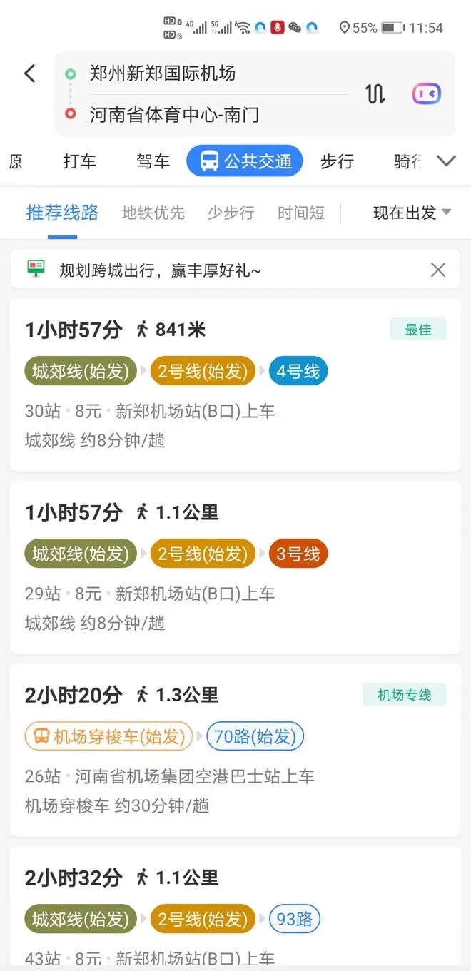 新郑机场来展会现场的游客,可以步行220米在城郊线新郑机场站上车,沿南四环方向乘坐14站,在南四环站下车换乘2号线,沿南四环—贾河乘坐7站,在东大街站下车换乘3号线,沿省体育中心方向乘坐10站,并在省体育中心站 (A口出)下车,步行 530米到河南省体育中心—南门,全程大约需要1小时39分钟。