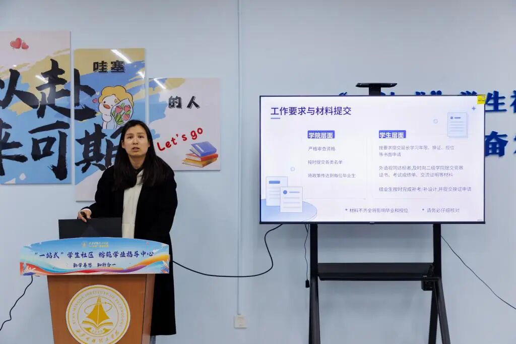为进一步帮助2026届毕业生全面、准确地了解毕业与学位授予的相关政策,同时做好就业准备,3月17日下午,智能制造与控制技术学院大四毕业班在“一站式”学生社区榕苑学业指导中心开展“毕业生学位授予文件解读”主题班会,班会由辅导员王菲、阮文成两位老师共同主持。