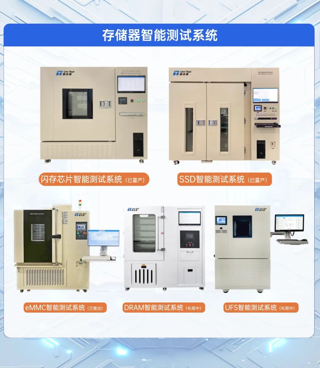 目前,公司已成功实现NAND Flash智能测试系统与SSD智能测试系统的市场化量产,并推出了eMMC智能测试系统,同时在UFS和DRAM智能测试领域开展前瞻布局。