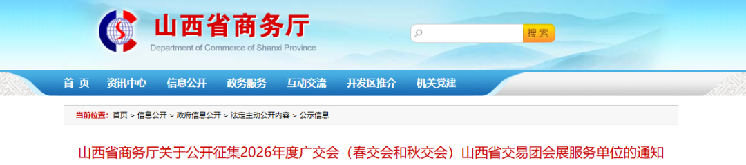 山西省商务厅关于公开征集2026年度广交会(春交会和秋交会)山西省交易团会展服务单位的通知