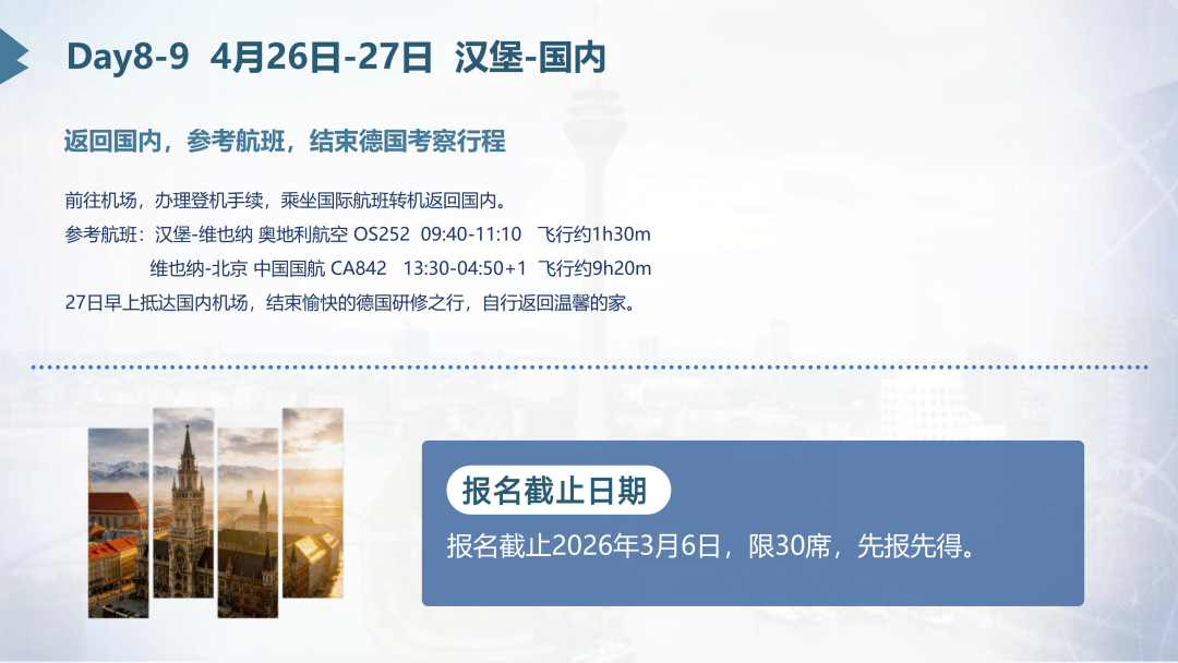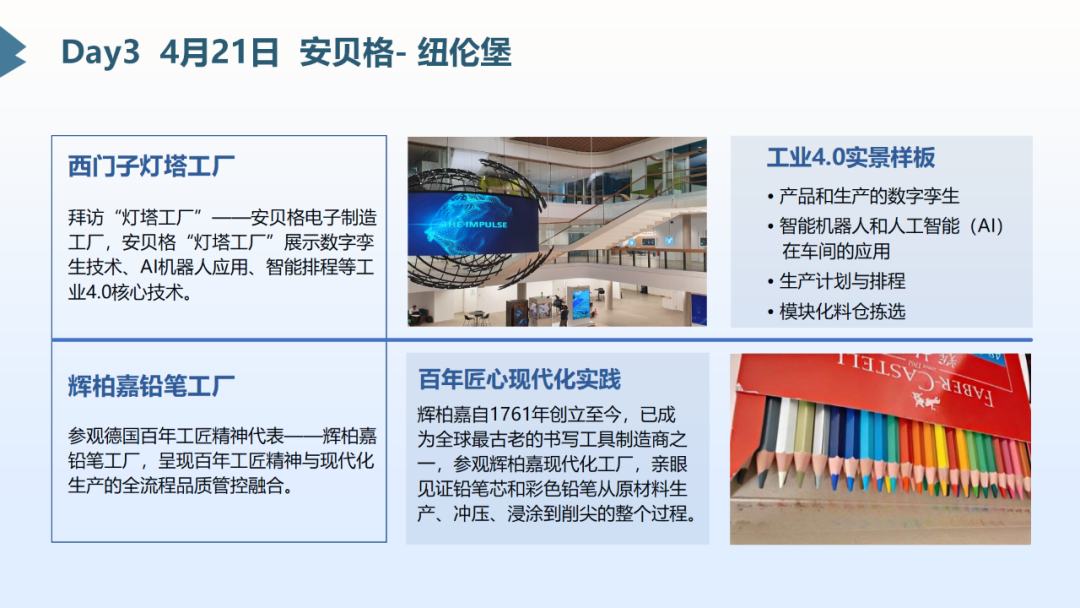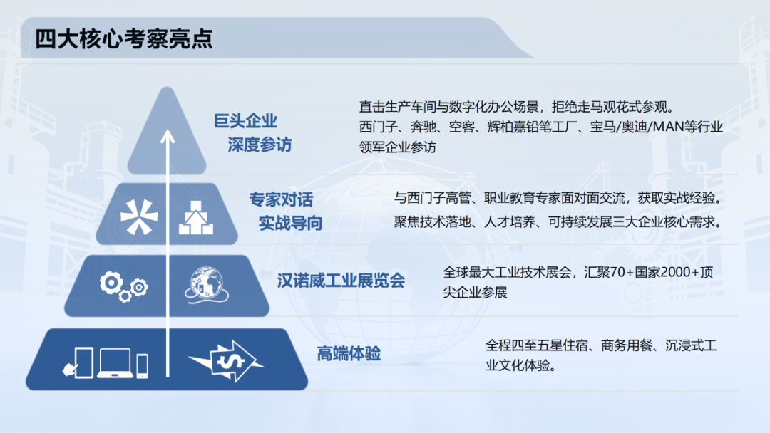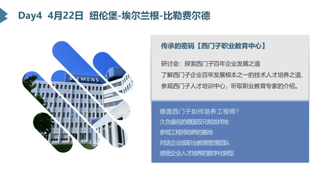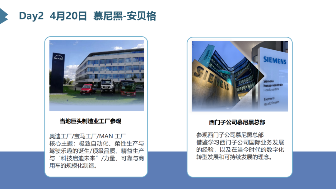 我们将带您走进西门子的心脏-慕尼黑总部、西门子先进数字化的代表-安贝格数字化中心和工厂、解析西门子人才培养的密码,并探访西门子数字化应用和生态企业-世界级的数字化企业等众多稀缺访学资源。