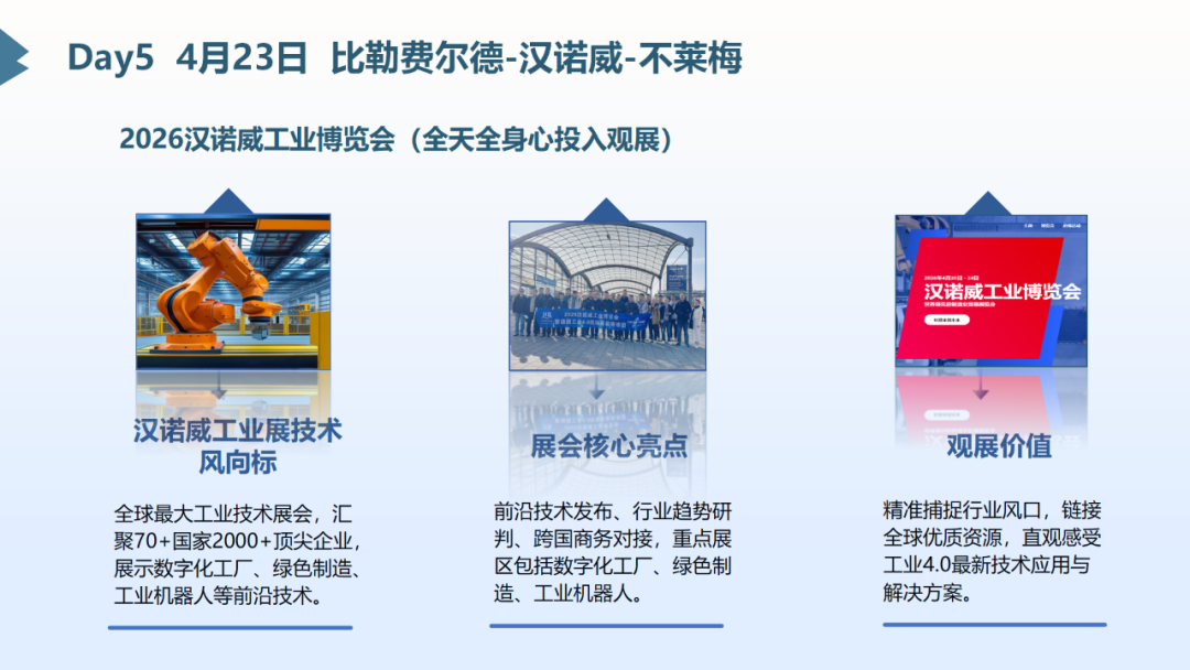 ◆随团专家全天讲解汉诺威工业展,了解德国及世界产品的发展和市场的具体需求,调整改进产品的结构,为生产高质量的产品奠定基础;