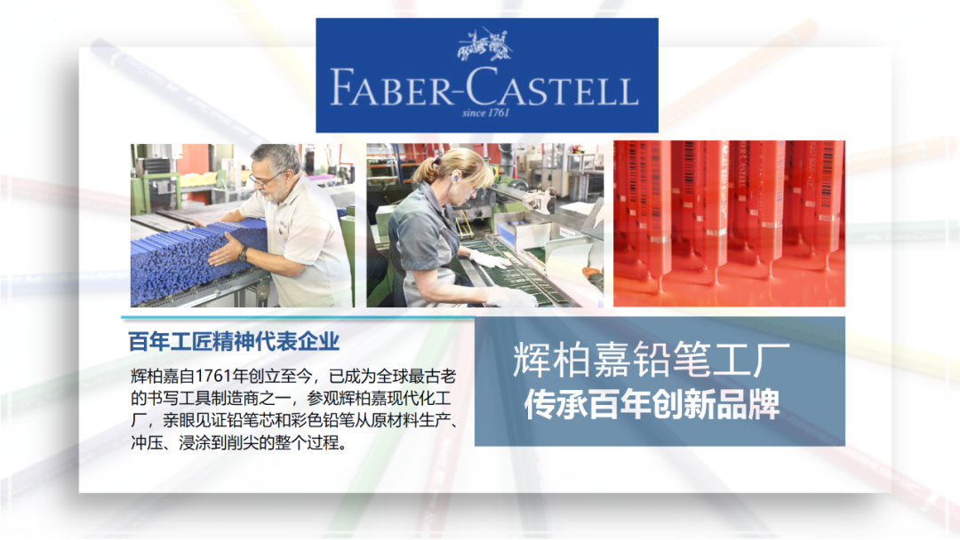 辉柏嘉自1761年创立至今,已成为全球最古老的书写工具制造商之一,参观辉柏嘉现代化工厂,亲眼见证铅笔芯和彩色铅笔从原材料生产、冲压、浸涂到削尖的整个过程。