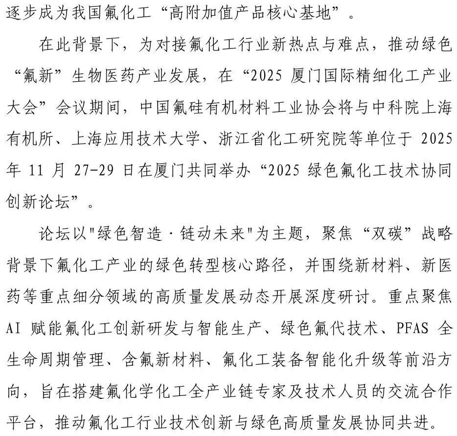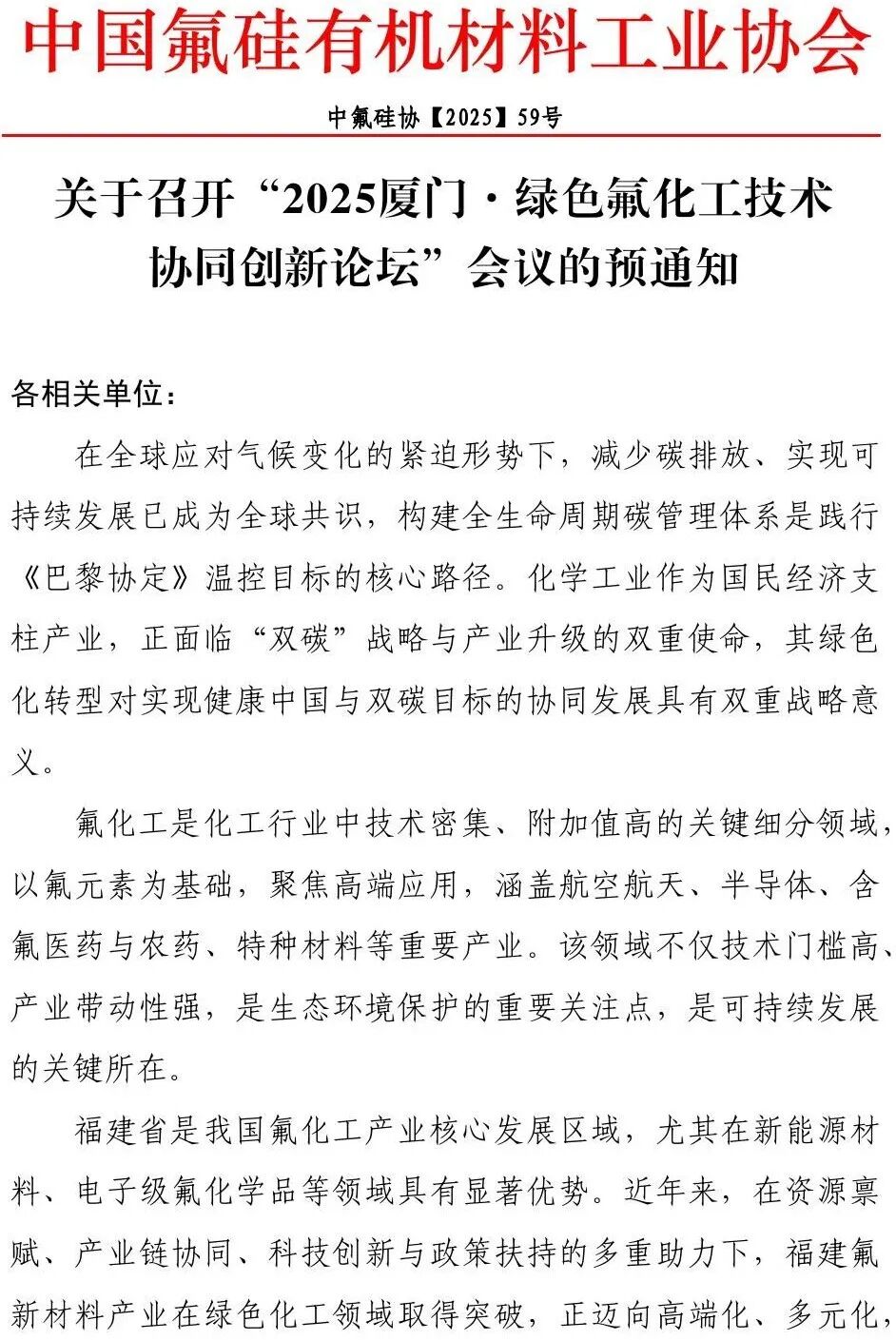 绿色转型正当时,协同创新赢未来!2025 厦门绿色氟化工技术协同创新论坛,期待您携技术、携需求、携机遇而来,共话氟化工产业高质量发展新蓝图,共筑绿色智造新生态!