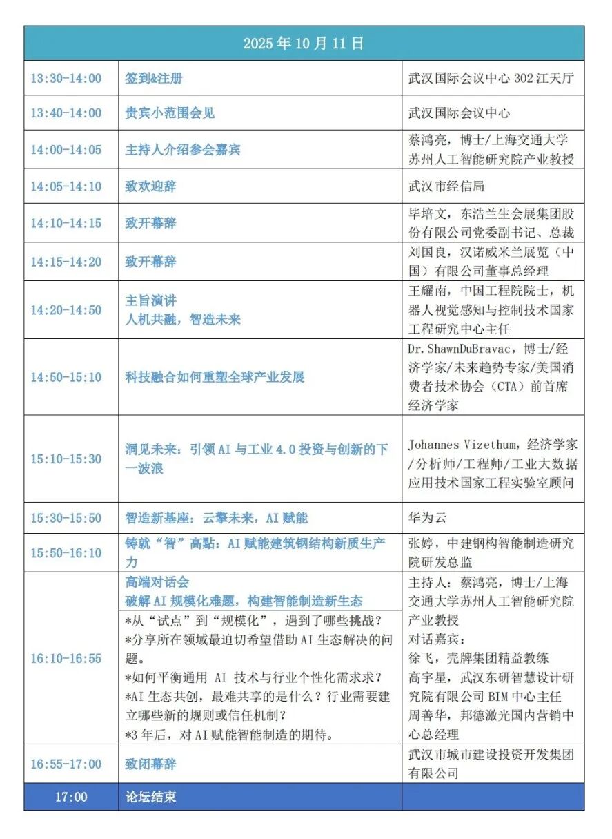 为进一步把握时代机遇,促进人工智能与传统制造业深度融合,将于10月11日举办AI赋能智造发展论坛。本届论坛作为“2025中国机博会与武汉工博会融合展”的重要同期活动,以“智造未来·AI赋能工业新引擎”为主题,旨在聚焦AI技术在工业场景的创新应用,探讨其如何为传统制造业注入新动能、塑造新模式、打造新引擎。