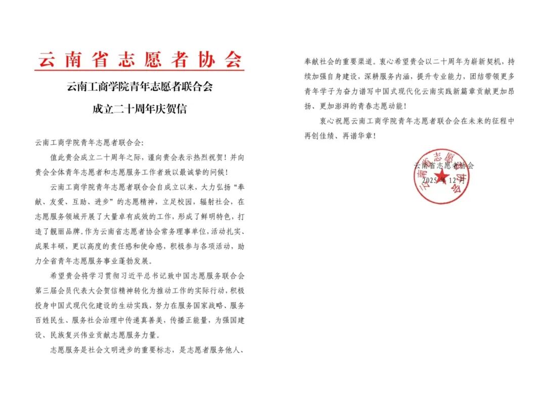 廿载芳华,初心如磐;青春当燃,志愿同行。云南工商学院青年志愿者联合会二十周年庆典不仅是一场深情的回顾,更是一次凝聚力量、再启新程的动员。站在新的历史起点,青志联将继续秉承“立足校园,服务社会”的宗旨,拓展服务领域,聚焦专业特色,在乡村振兴、生态文明、民族团结、社会关爱等方面积极作为,鼓励更多学子“到西部去,到基层去,到祖国最需要的地方去”,在为中国式现代化挺膺担当的实践中,继续书写无愧于时代、无愧于青春的壮丽篇章。