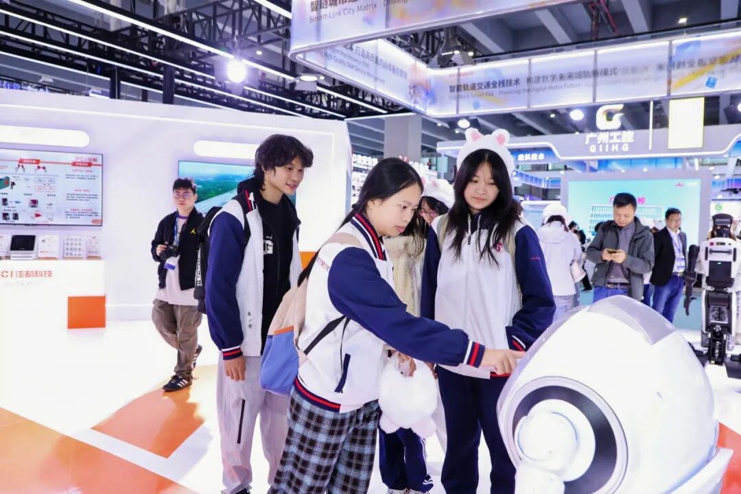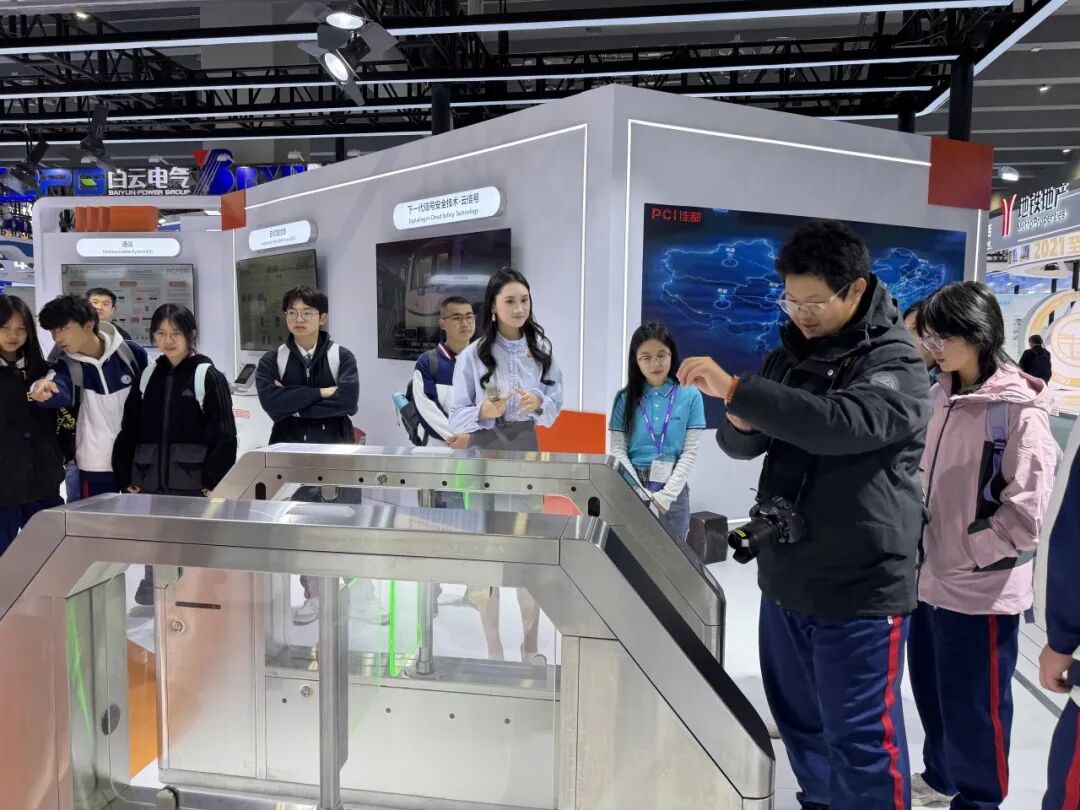 展会期间,广州市多所高校轨道交通专业研学团齐聚展馆。他们着装整齐,眼神期待兴奋,在工作人员引导下有序入场,怀揣对轨交领域的憧憬,欲在此汲取知识、拓宽视野,为职业发展筑基。