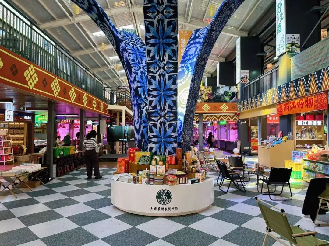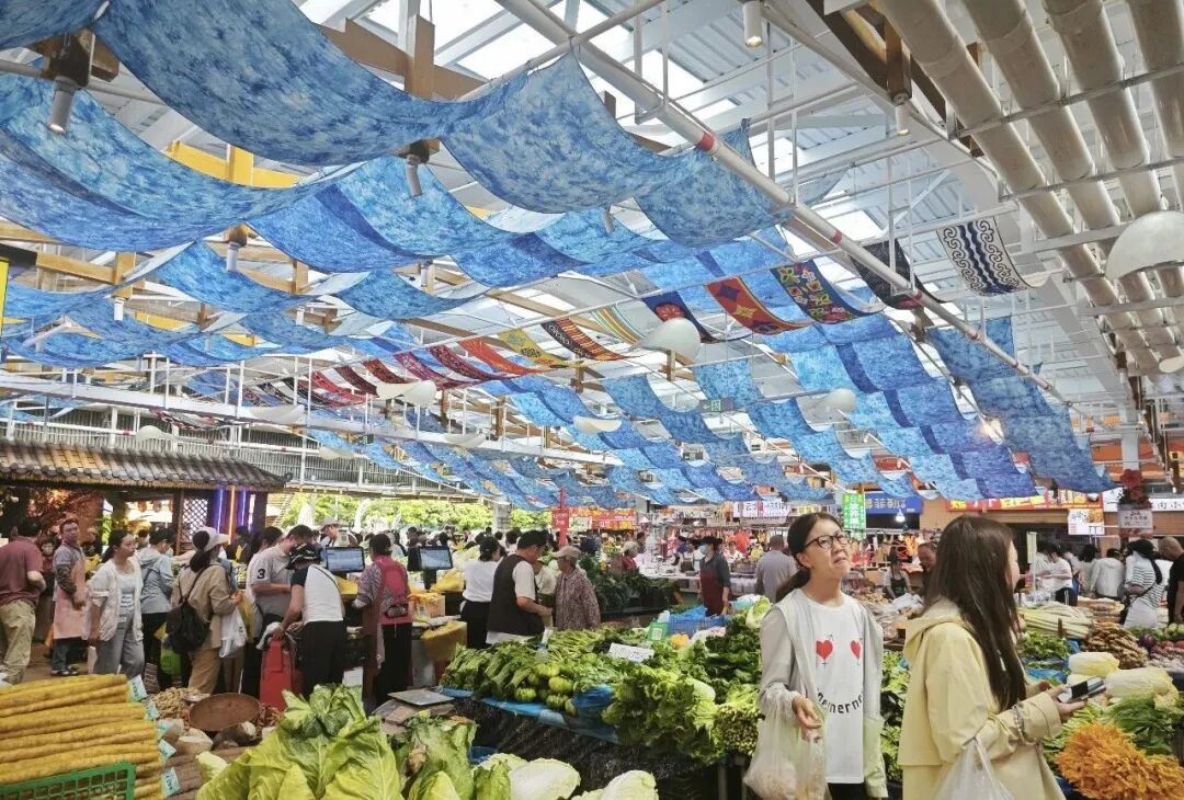 我们做的是分层的空间焕新。在一号大棚,我们强化“民生区”,但加入了云南扎染天幕、民族布艺装饰。你抬头是非遗的蓝,低头是生鲜的绿,视觉冲击很强,环境好了,叔叔阿姨买菜的时候心情也就好。在二号大棚,我们打造了“沉浸式云品生活体验区”,有云品展示、多肉走廊、轻食花艺区。年轻人来这里拍照打卡,家庭来这休闲购物,而本地阿姨照样能买到她认准的那家土鸡。