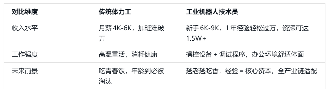 ▫ 案例 1:李师傅(38 岁,高中毕业)之前在重庆某汽车零部件厂干体力活,月薪 5K+,每天搬重物 10 小时,腰肩常年酸痛。2025 年报名巴蜀职校工业机器人培训,毕业后被推荐到某物流做机器人运维技术员。现在月薪 1.2W,朝九晚五,坐在操控室调试设备,工作轻松体面,老板还主动涨薪留任,直言 “有经验的技术工太稀缺”!
