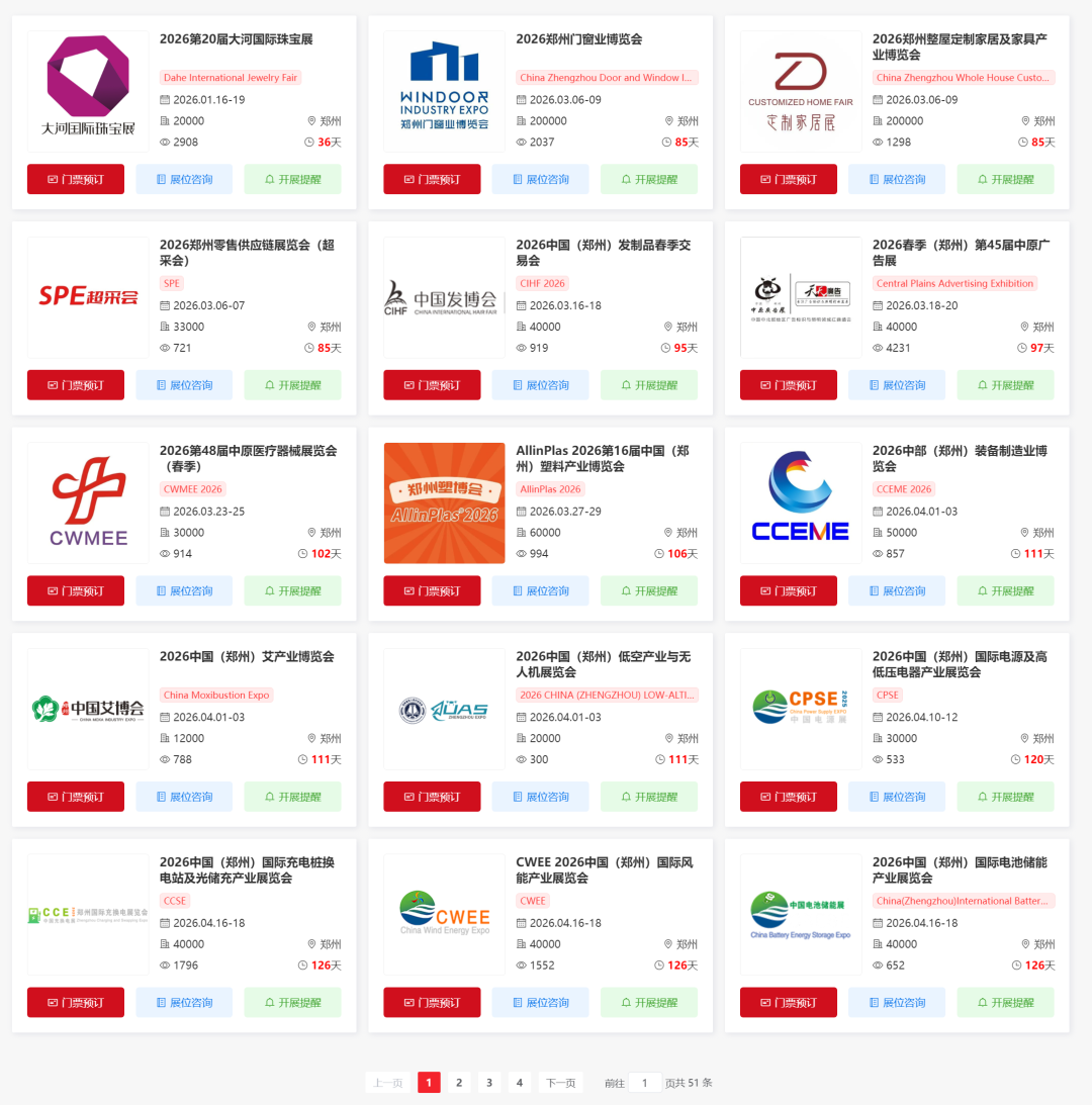 2026年郑州将举办多场重要的展会活动,涵盖了珠宝、家居、门窗、零售、美发、广告、医疗器械、塑料、工业、中医、无人机、电力、电池、风能、充电桩、电线电缆、安全、加盟、文化、泳池桑拿、糖酒、美容、工业、五金、农业、自有品牌展等多个领域。小编为大家整理了2026年郑州全年展会排期表,希望能帮助你规划行程。末文获取郑州展会门票预约入口~(大多门票限时免费)