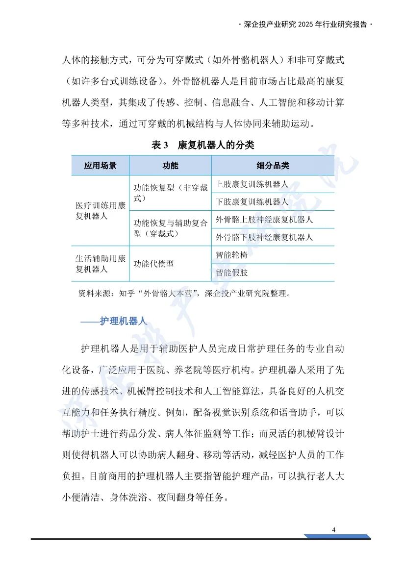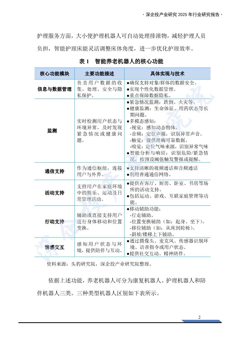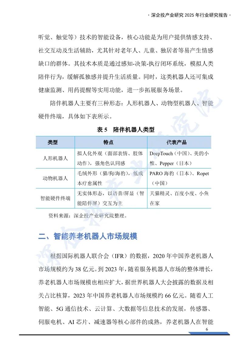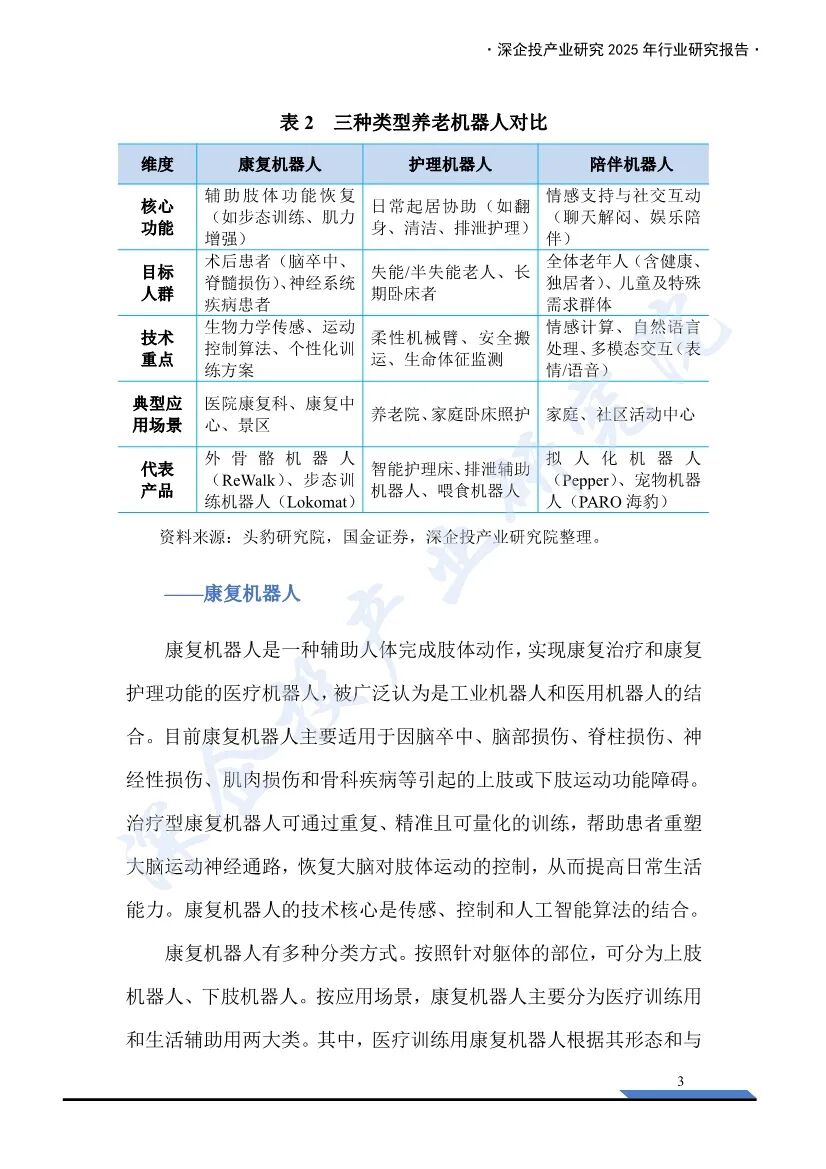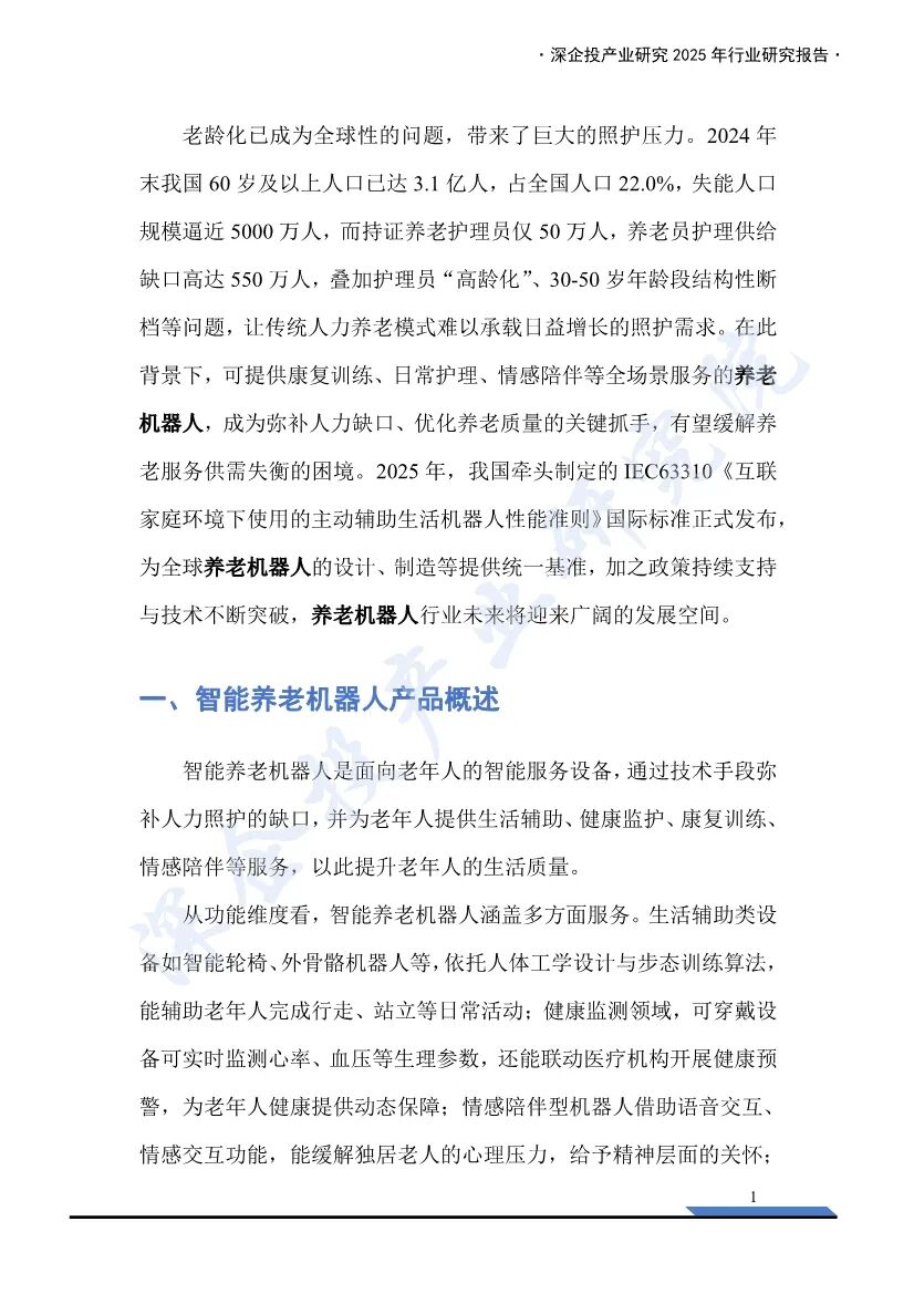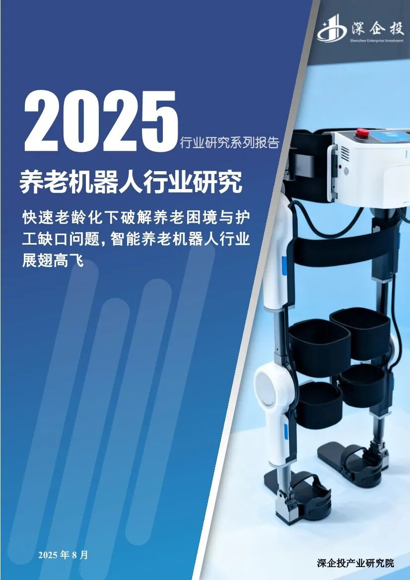 这份《2025养老机器人行业研究报告》由深企投产业研究院发布,深入分析了养老机器人行业的现状、市场规模、需求驱动力、竞争格局、商业模式以及融资情况,为行业从业者、投资者和相关方提供了全面的参考。- 人口老龄化加速:2024年末,中国60岁及以上人口已达3.1亿人,占全国人口22.0%,失能人口规模逼近5000万人。而持证养老护理员仅50万人,养老护理供给缺口高达550万人。传统人力养老模式难以承载日益增长的照护需求。- 政策支持:国家和地方政府出台了一系列政策,推动智能养老机器人行业发展。例如,2025年我国牵头制定的IEC63310《互联家庭环境下使用的主动辅助生活机器人性能准则》国际标准正式发布,为全球养老机器人的设计、制造提供统一基准。- 康复机器人:辅助人体完成肢体动作,实现康复治疗和康复护理功能。主要适用于因脑卒中、脑部损伤、脊柱损伤等引起的运动功能障碍。- 护理机器人:辅助医护人员完成日常护理任务,如大小便清洁、身体洗浴、夜间翻身等。- 陪伴机器人:提供情感支持、社交互动及生活辅助,尤其针对老年人、儿童、独居者等易产生情感缺口的群体。- 市场规模:2020年中国养老机器人市场规模约为38亿元,到2023年增长至66亿元。预计到2030年将达到183亿元。- 市场潜力:养老场景B端和C端的机器人市场潜力巨大,五年内有望突破170亿元。全球外骨骼机器人市场正进入高速增长期,预计2030年将突破120亿美元。 - 海外企业:如HOCOMA(瑞士)、Ekso Bionics(美国)、Cyberdyne(日本)等,凭借早期技术积累和品牌优势,在高端医疗外骨骼领域占据主导地位。 - 国内企业:如傅利叶智能、迈步机器人、大艾机器人等,部分头部企业在技术研发与商业化落地方面已能与国际水平比肩。- 护理机器人:国内外均有代表性企业,如三菱重工、Cyberdyne等海外企业,以及欧圣电气、埃斯顿等国内企业。- 陪伴机器人:产品形态多样,价格多集中在千元区间,主要参与厂商包括优必选、美的等。- 收费模式:包括一次性买断、按月/年收取服务费、数据增值服务、使用时长收取服务费等。- 康复机器人:傅利叶智能在2025年完成E3轮融资3亿元,迈步机器人完成A+轮融资数千万元。- 护理机器人:智慧养老科技在2024年完成A轮融资8000万元。- 陪伴机器人:银发科技在2025年完成种子轮融资2500万美元,跃然创新完成A轮融资2亿元。养老机器人行业在人口老龄化加速、护工缺口扩大和政策支持的背景下,迎来了广阔的发展空间。康复机器人、护理机器人和陪伴机器人在技术、市场和商业模式上均取得了显著进展。未来,随着技术的不断突破和市场的进一步拓展,养老机器人行业有望成为应对老龄化社会的重要支柱。部分内容预览